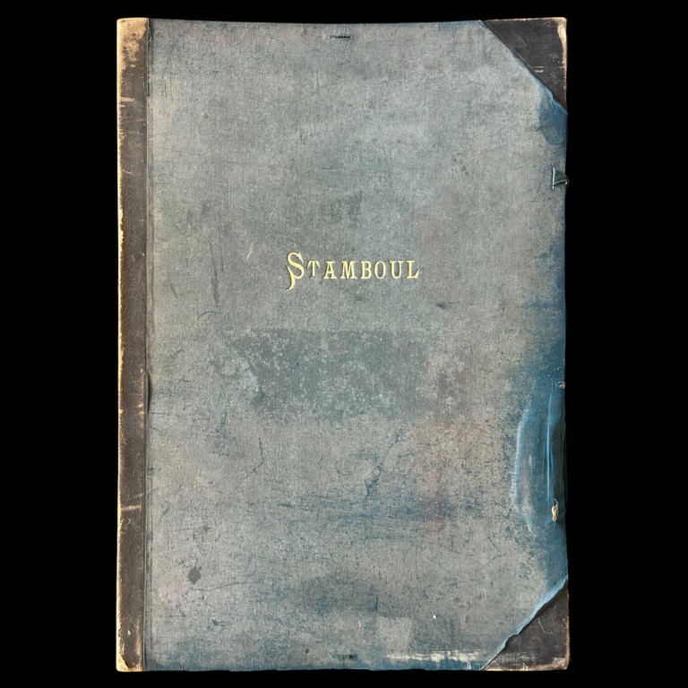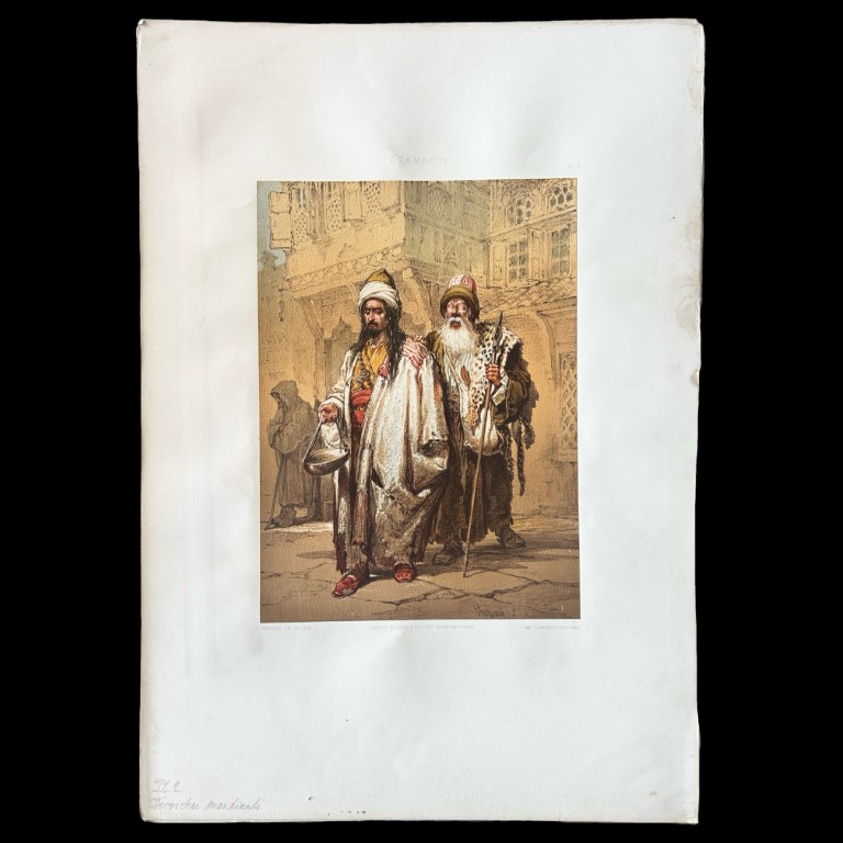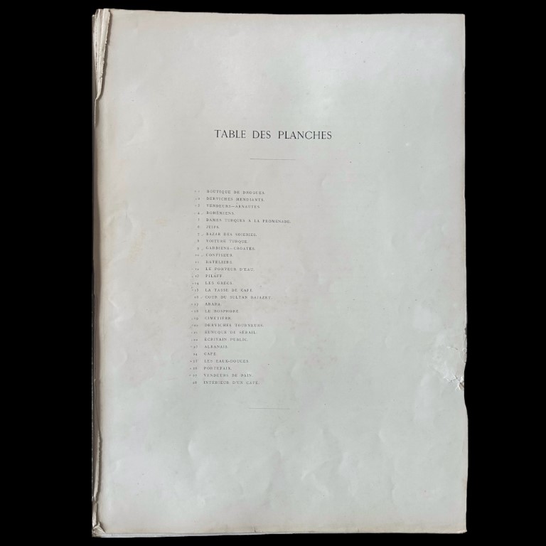 Part of the Encyclopaedia of the Decorative Arts of the Orient. Large folio, incomplete, consisting of frontispiece, index and 17 colour lithographs illustrating the traditional customs of Istanbul, all contained within original cloth-covered cardboard folder. Inside showing Ex Libris from the Emil & Helene Jaensch collection. An Orientalist painter originally from Malta, Amadeo Preziosi (1816- 1882) arrived in Istanbul at the end of 1842 and lived there until his death in 1882. He became famous as the painter who reflected contemporary life in Istanbul. He was also employed as court painter during the period of Abdulhamid II.