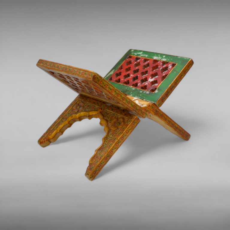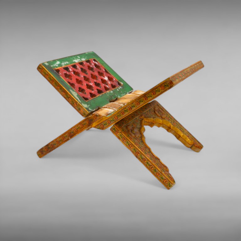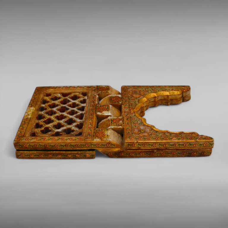 The exterior painted with red and green floral elements with gold details. The stone carved on the feet to form poly-lobed arches and with latticed openwork decoration on the other end. Interior painted in red with green border.