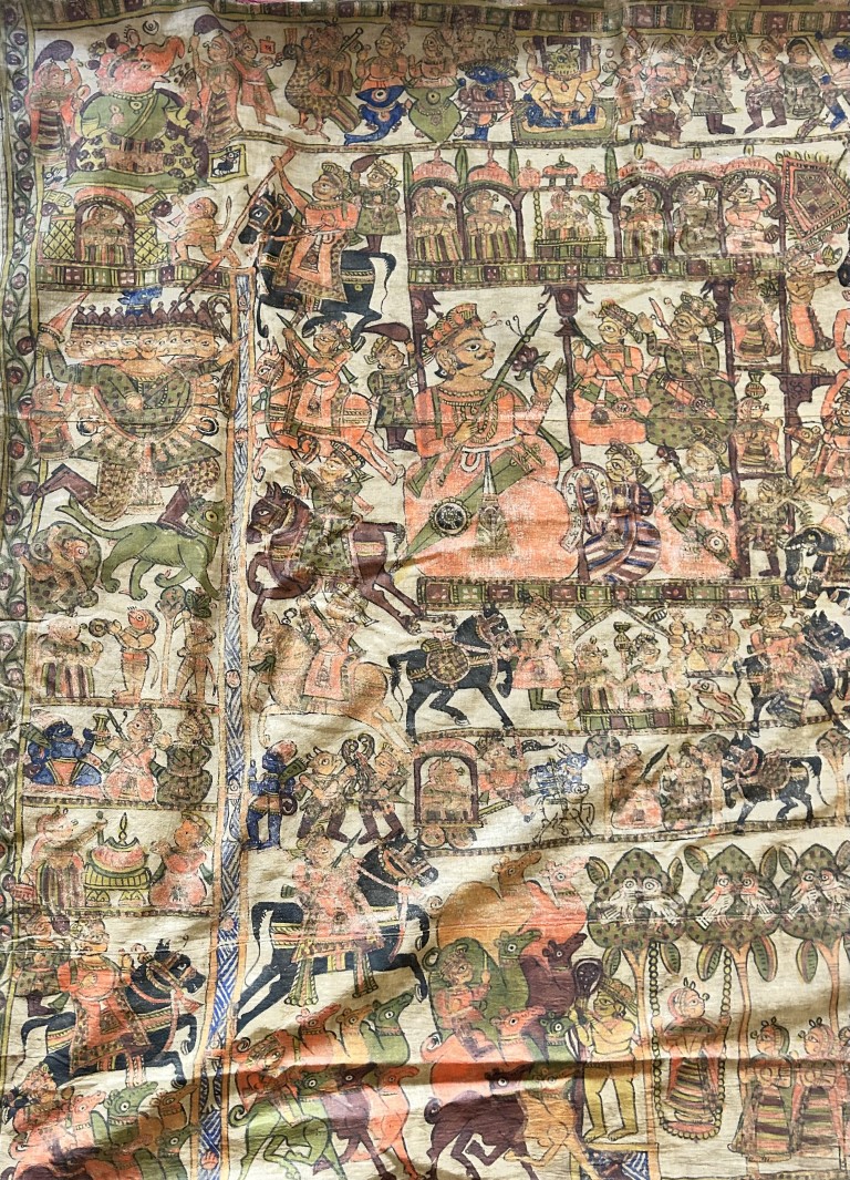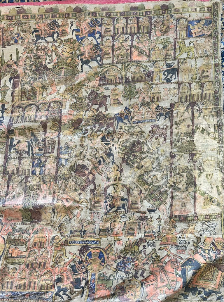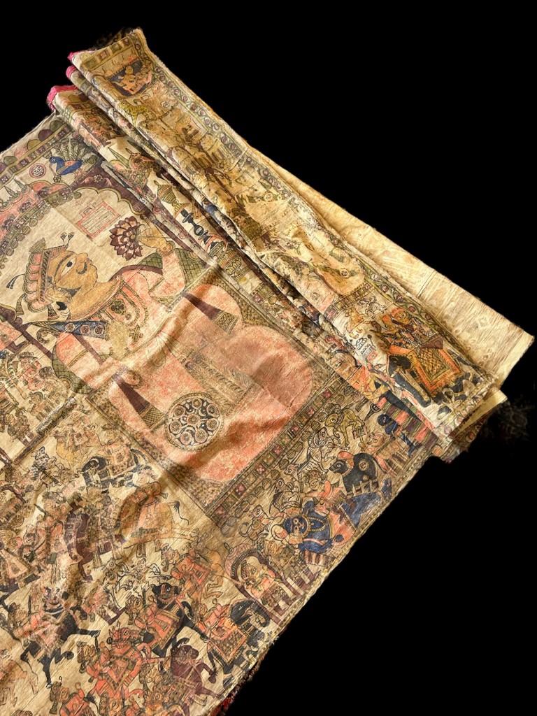 Tempera on cloth, depicting the heroic deeds of Pabuji, revered as the incarnation of a deity. A popular Rajasthana deity, the legend of Pabuji is narrated through a traditional art of storytelling called Phad whose artists create these long historiated depictions (Pabuji Ki Phad), to be used during musical performances. Long devanagari inscription above the charcater. Currently the market is saturated with modern and reduced reproductions, though this specimen is definitely ancient and for devotional use. For further reading see John D. Smith, The Epic of Pabuji: A Study, Transcription and Translation, Cambridge University Press, 1990.