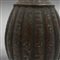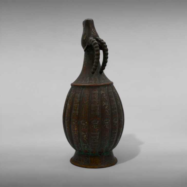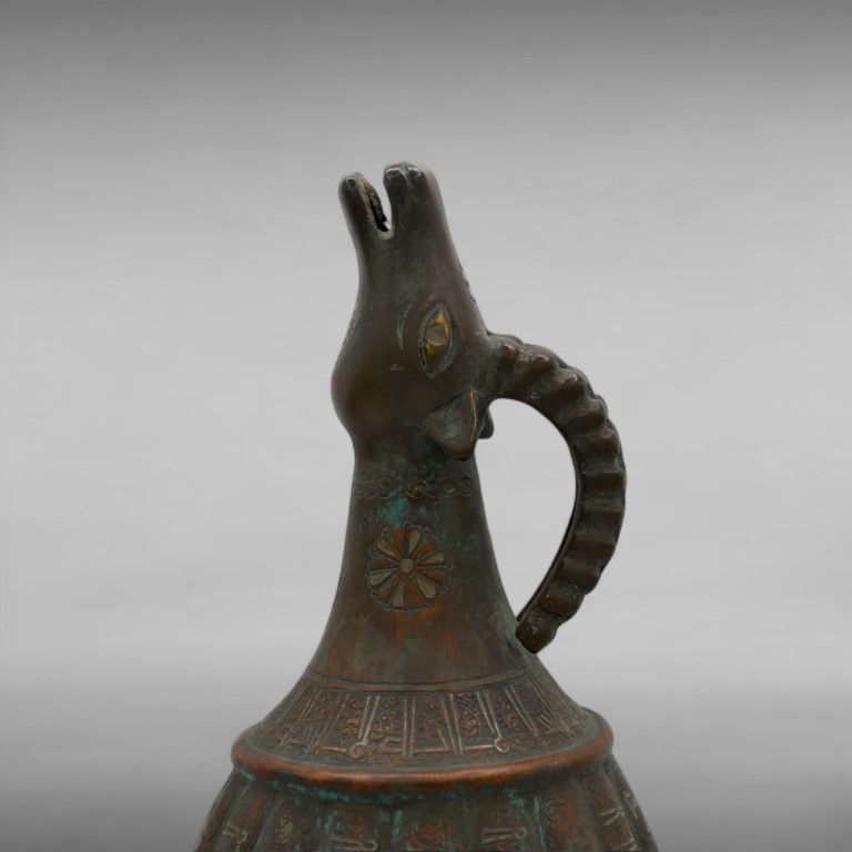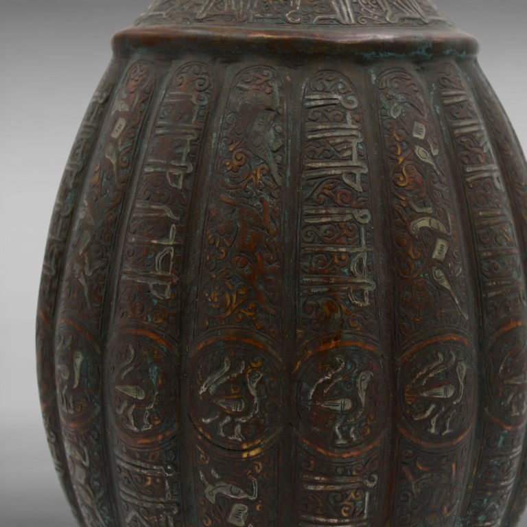 Ribbed body, resting on a high foot, neck in the shape of a ram. Decorated with inscriptions and floral elements inlaid with copper and silver threads.