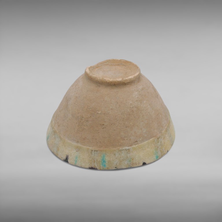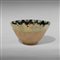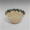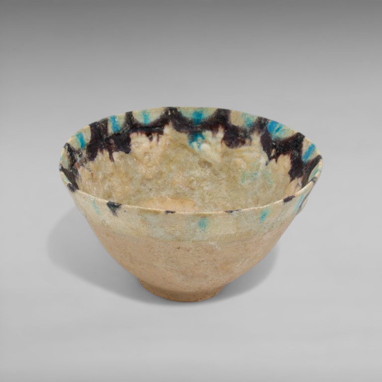 Of siliceous body, the inner walls with mould decoration in relief, covered with iridescent glaze, turquoise drippings on the inner rim bordered by manganese scalloped motif.
