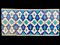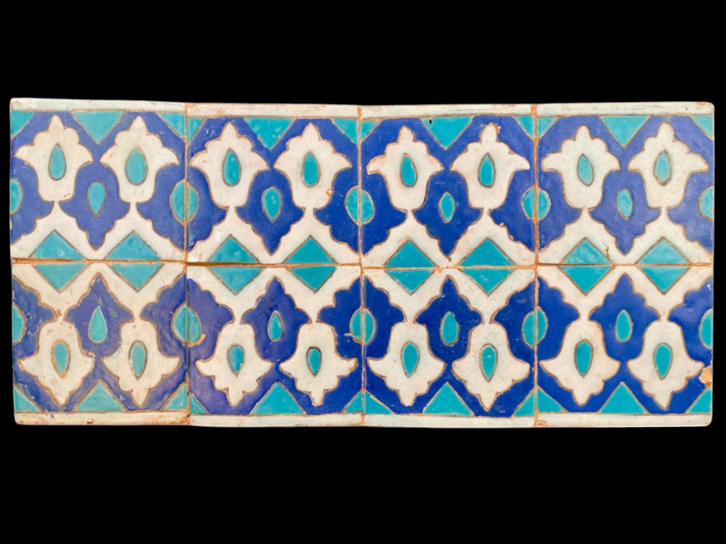 Composed of 8 tiles mounted on a wooden board, each depicting three connected hamsa, two of white color and one cobalt blue. The vertical conjunctions with the other tiles are turquoise rhombuses. Potentially infinite patterns such as this allude to one of God's main characteristics of being with no end and no beginning.