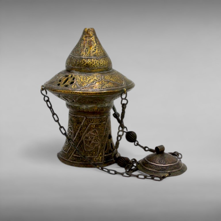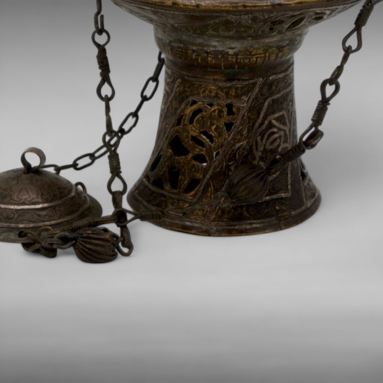 brass sheet in the form of a flared apex with suspension chains, the exterior engraved with plant racemes within arabesques inlaid with silver thread.
