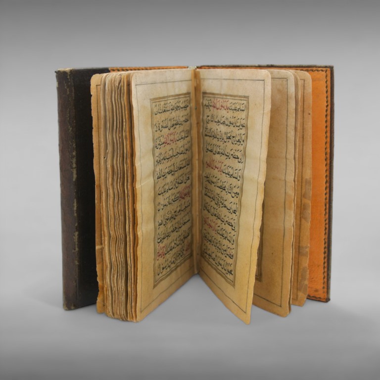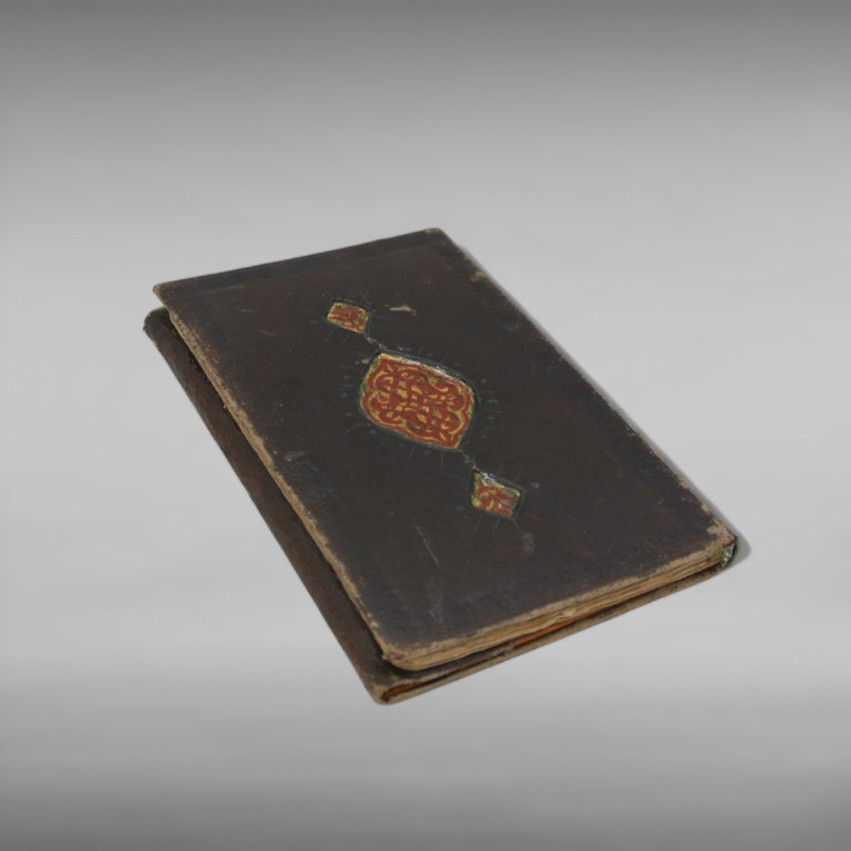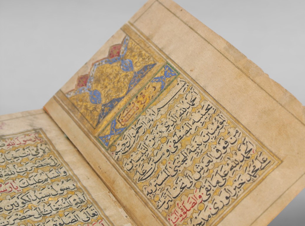 Arabic manuscript on paper, composed of 58 papers, complete. Folio 132 x 80 mm, writing box 98 x 50 mm. Text in Naskh script on a single column of 17 lines in black ink, with important words in red ink.The decoration includes four frontispieces (unwan) illuminated in gold and colours and numerous chapter titles in white or gold ink. Persian margin notes in nasta'liq calligraphy . Leather binding with flap decorated in red and gold.Traces of use and reinforcement on some papers, restored tear in last paper.