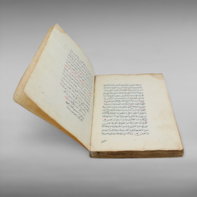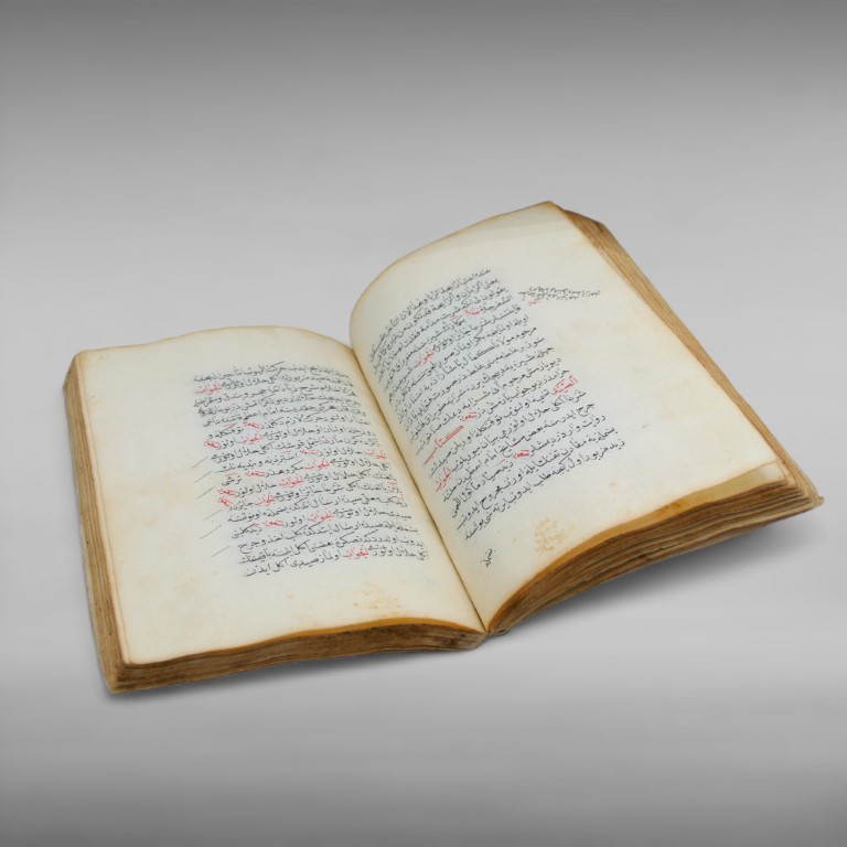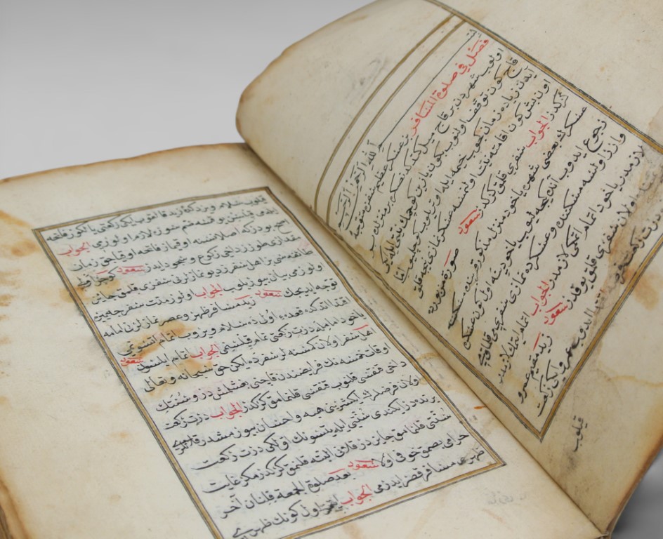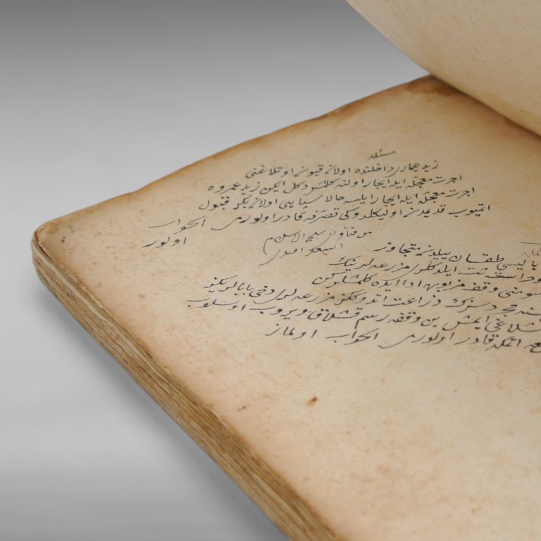 Manuscript on polished, laid and watermarked paper, in the Osmanili (Ottoman Turkish) language. Composed of 147 folios, 146 of text only. Sheet: c. 204 x 133 mm; writing rule: c. 136 x 73 mm; 17 lines to the page in black and red ink. Frontispiece missing, but the first two pages bear writing box outlined by gilt fillet. The text consists of a miscellany of legal judgments issued by famous Ottoman jurists, including those by the celebrated jurist of the Hanafite school 'eAb. as-Su..d, known in Turkish as Ebusuud.