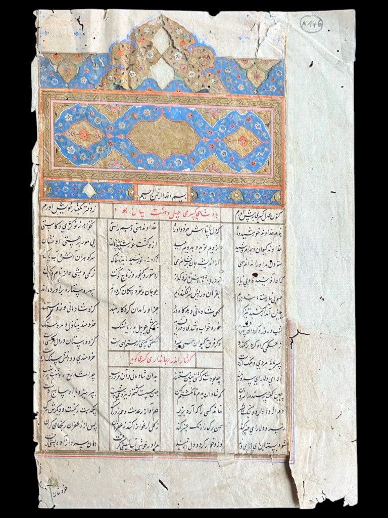 Persian text on paper. Script box c. 140 x 135 mm surmounted by multicoloured floral illumination on a gold background with blue poly-lobed reserves. Text in nasta'liq script arranged in four columns and penned in black ink with titles in red. Reclamantes in Persian in the lower margin. Restoration.