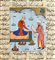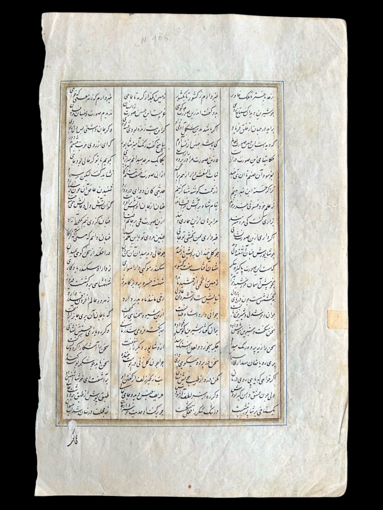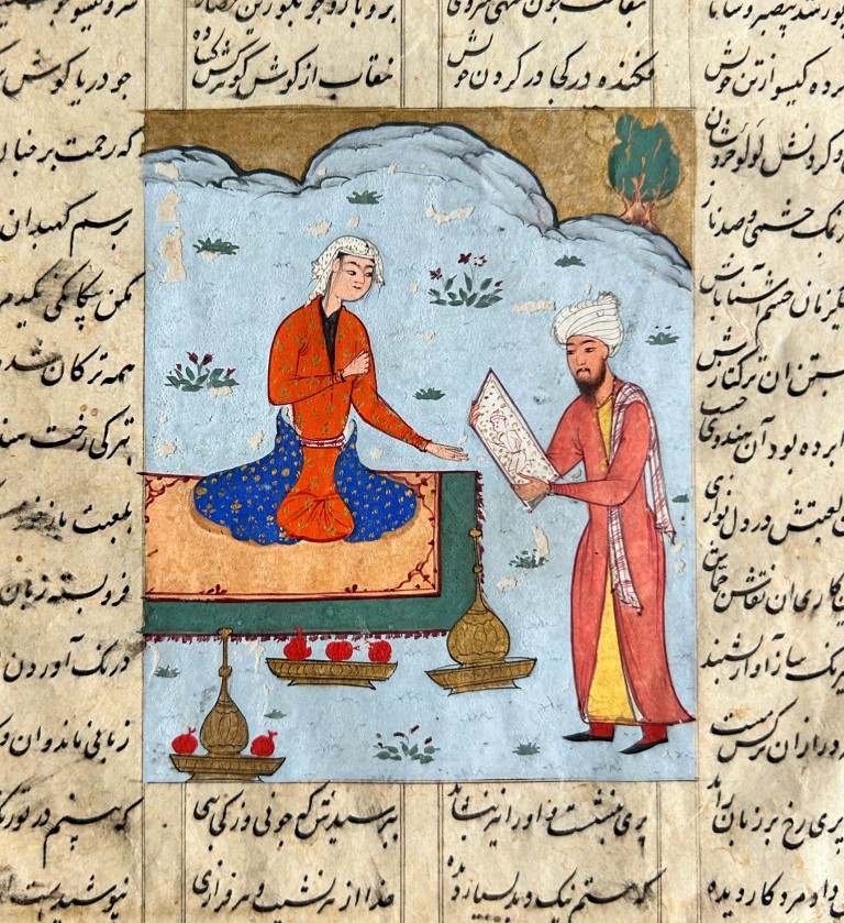 Persian text on paper, writing box approximately 200 x 130 mm bordered by gold and blue thread and containing 21 lines of text on both sides, written in nasta'liq calligraphy in black ink with title in red. Decorated with a depiction of the painter Shapur handing Khorsow's portrait to Shirin.