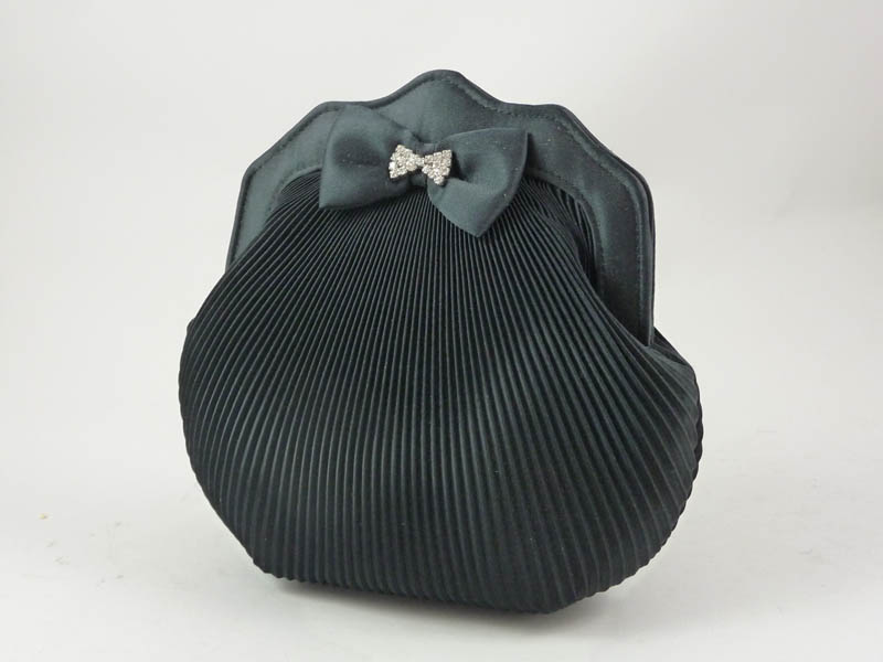 BORSA NERA IN RASO - BLACK SATIN CLUNTCH modello da sera in raso plissettato nero, dettaglio di fiocco in raso impreziosito da fiocco in strass, tracolla