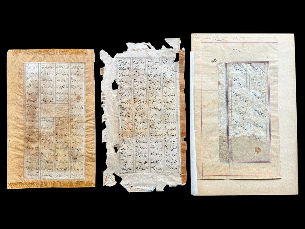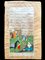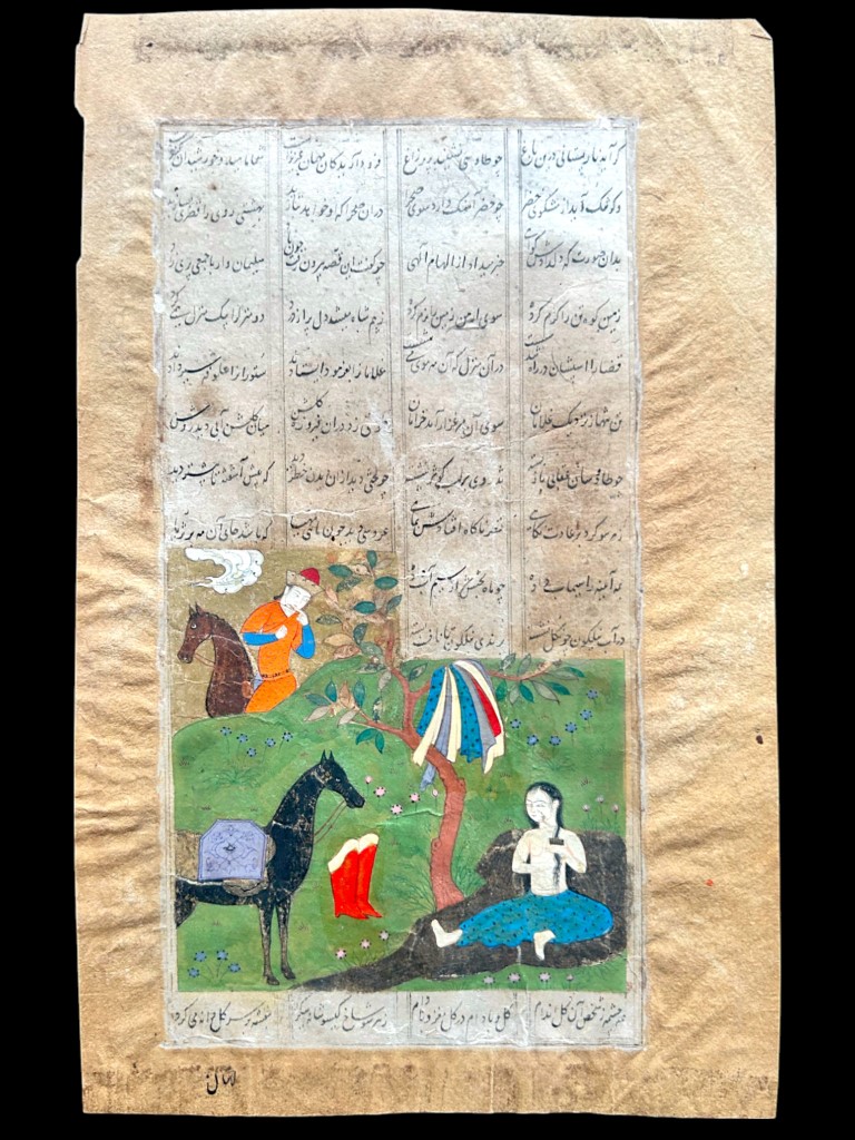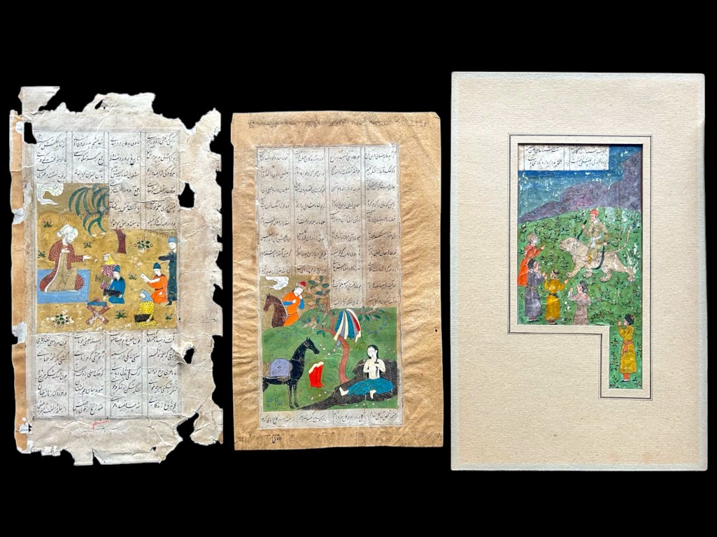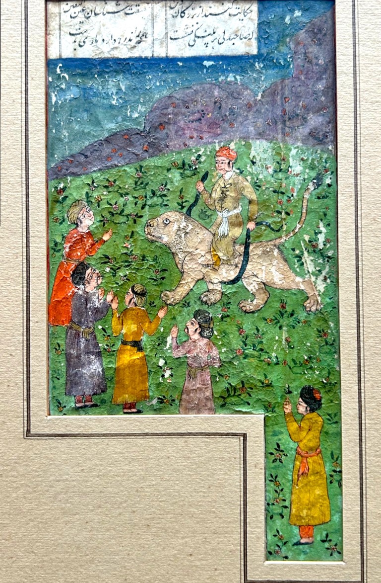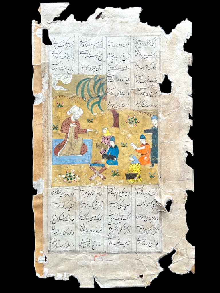 decorated and inscribed on both sides in nasta'liq script written in black ink and arranged in four columns bordered by gilt fillet. The larger folio illustrated with a schoolmaster giving a lesson to five pupils in a garden, the other decorated with a man taming a lion among onlookers.