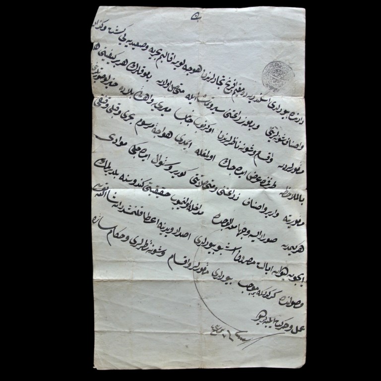 Turk Azerbaijani text on paper, consisting of 9 lines of text written in black ink in cursive diwan.Persian stamp in upper right corner inscribed with the name of Muhammad Ali Abd. Dated 43 (possibly 1243 AH equal to 1827 AD solar calendar).