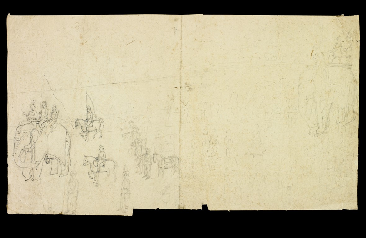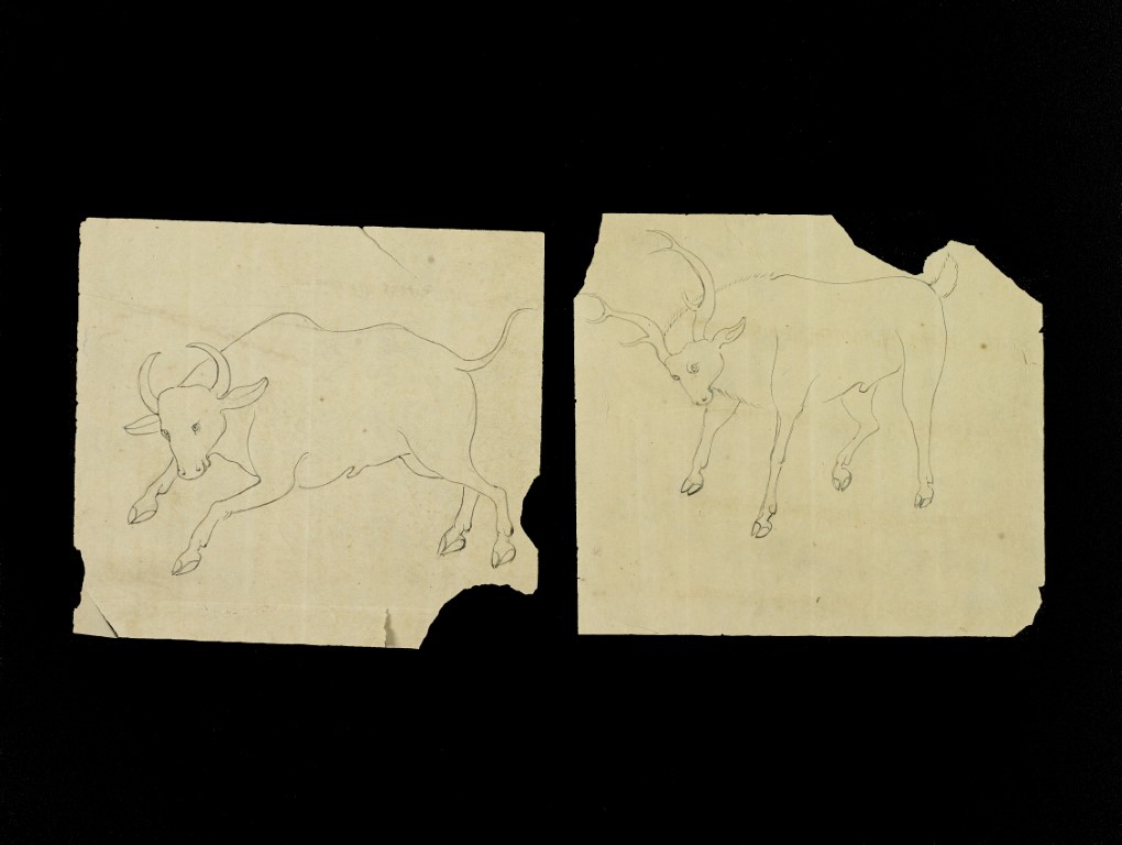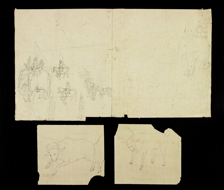 Including: a sketch depicting a royal procession; a running buffalo and a ram.