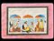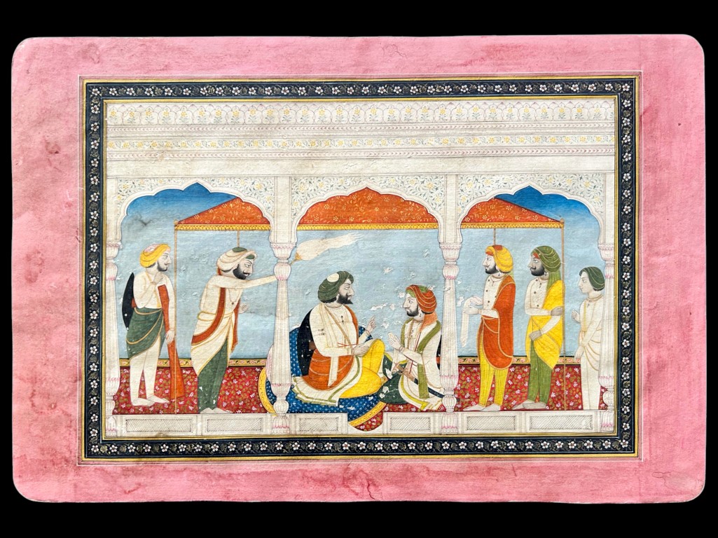 Within a refined setting characterised by a sumptuous white marble building with floral inlays and chiselling, the scene has six high-ranking Sikh characters arranged two per archway, the last on the right also including an attendant in the corner, all under an orange canopy. The characters are in their well-groomed and colourful robes and turbans typical of the Sikh religion. The main characters are in a central position, on the left of the composition an attendant is waving a fly-whisk and on the right one of the characters is carrying a white drape.