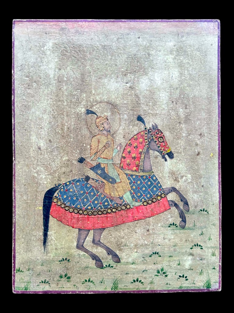 Depicting the last of the great Moghals in profile, riding a prancing horse. Colourless background and soil with scattered grass plants. Provenance: Private collection Tuscany.
