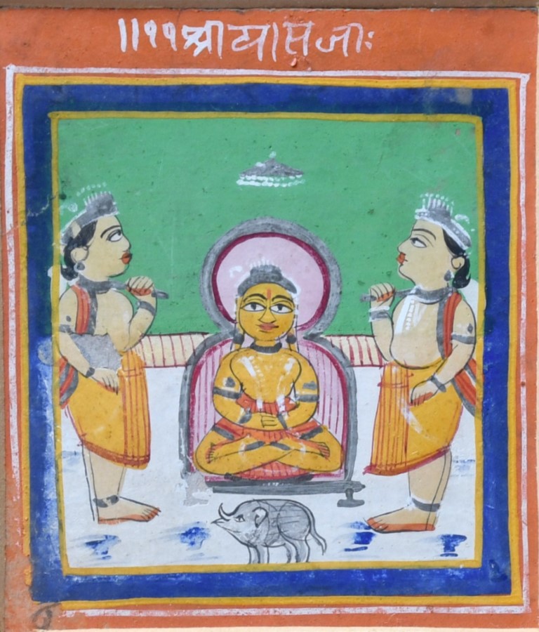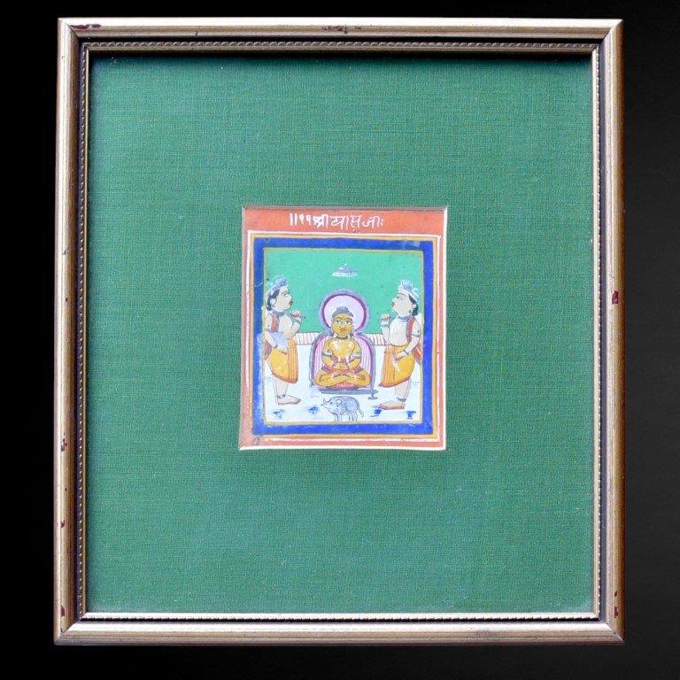 Tempera on paper, depicting the thirteenth tirthankara of the present era, seated in padmasana, flanked by two worshippers. Short devanagari inscription on the upper edge.