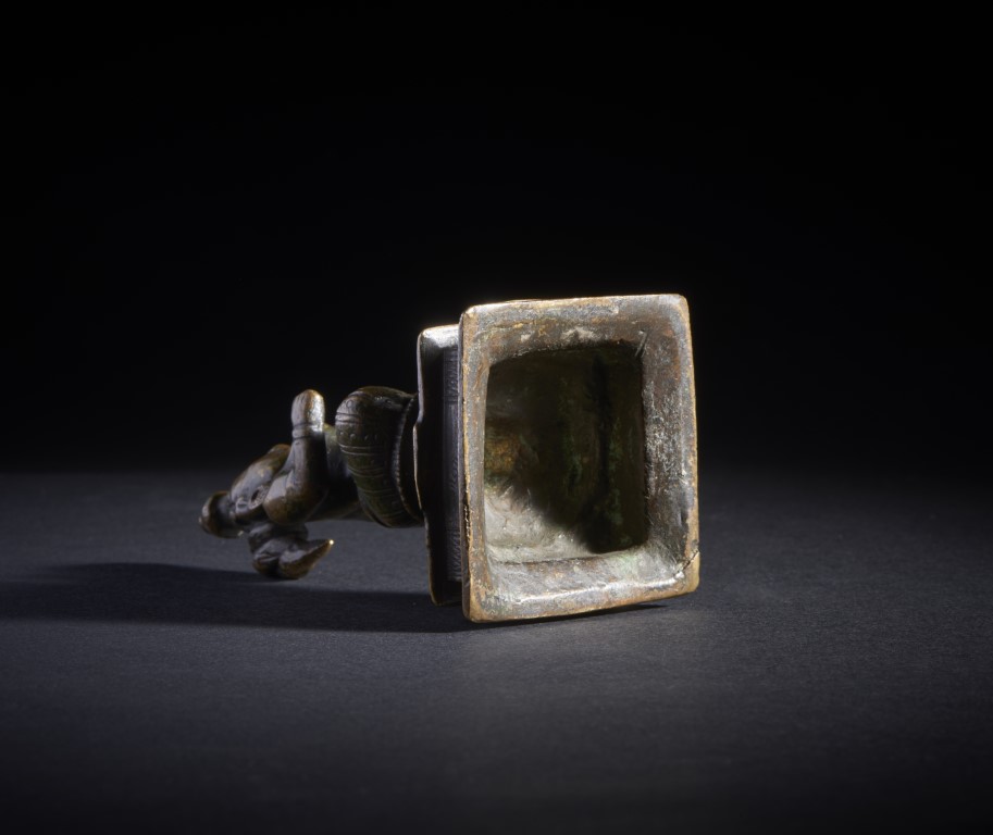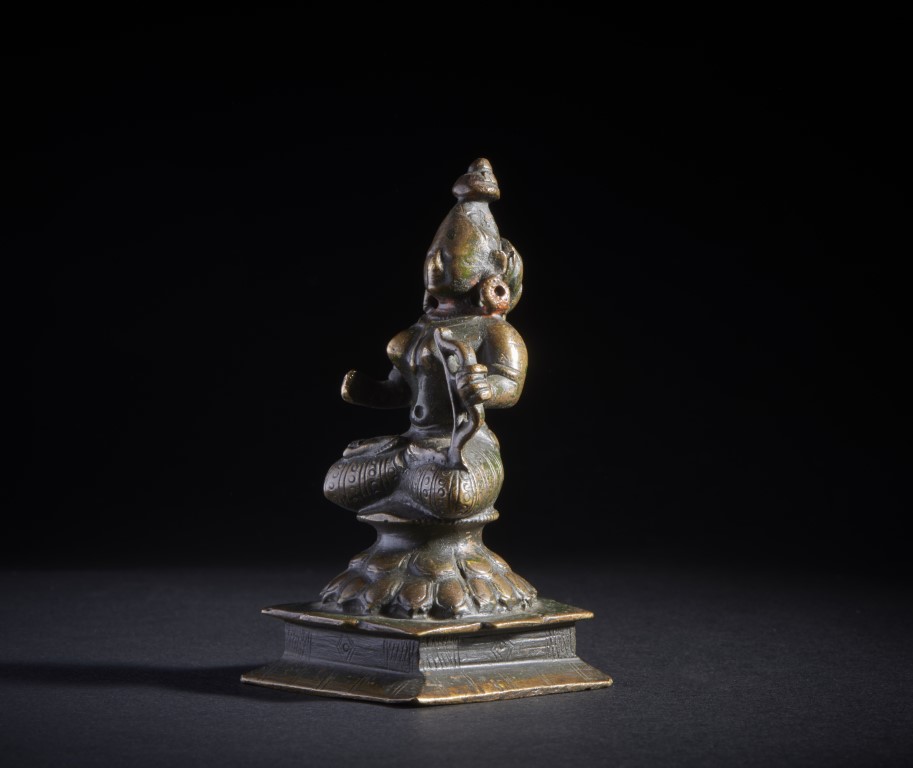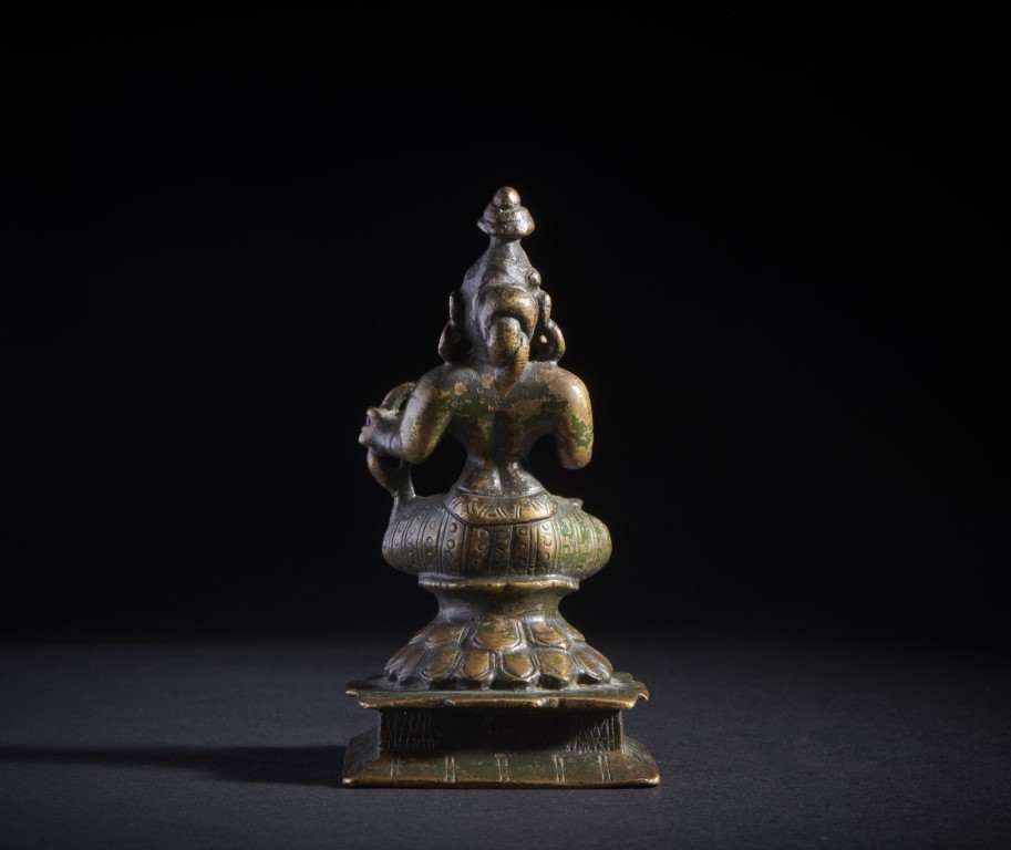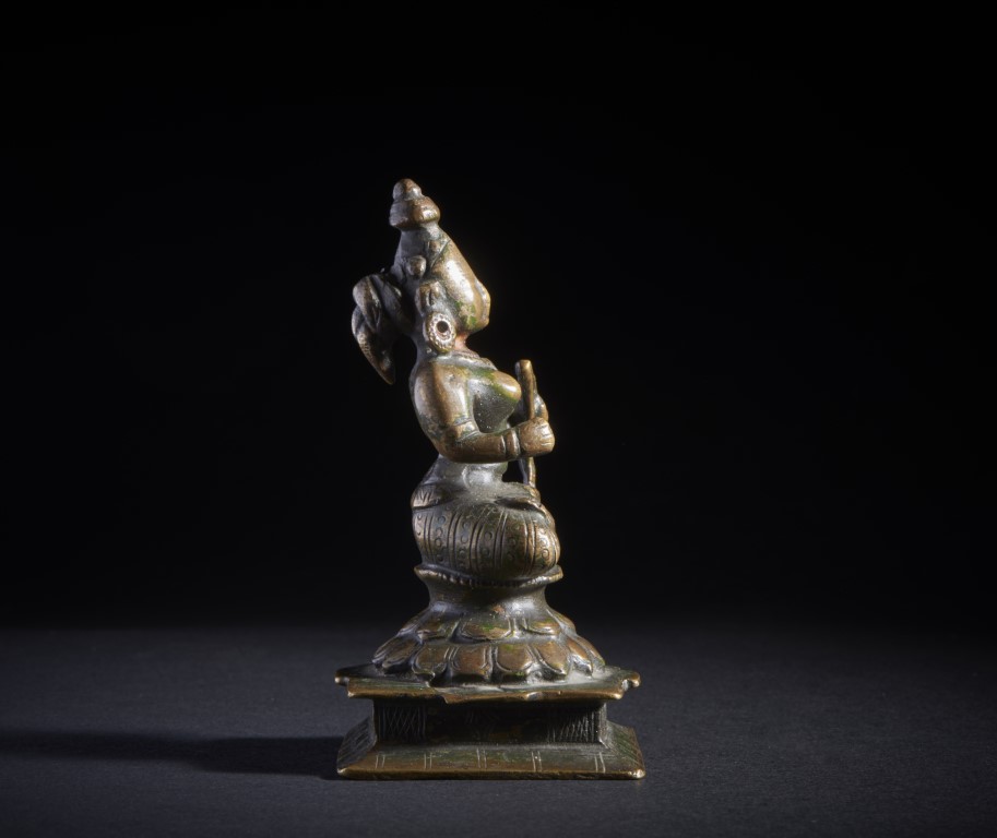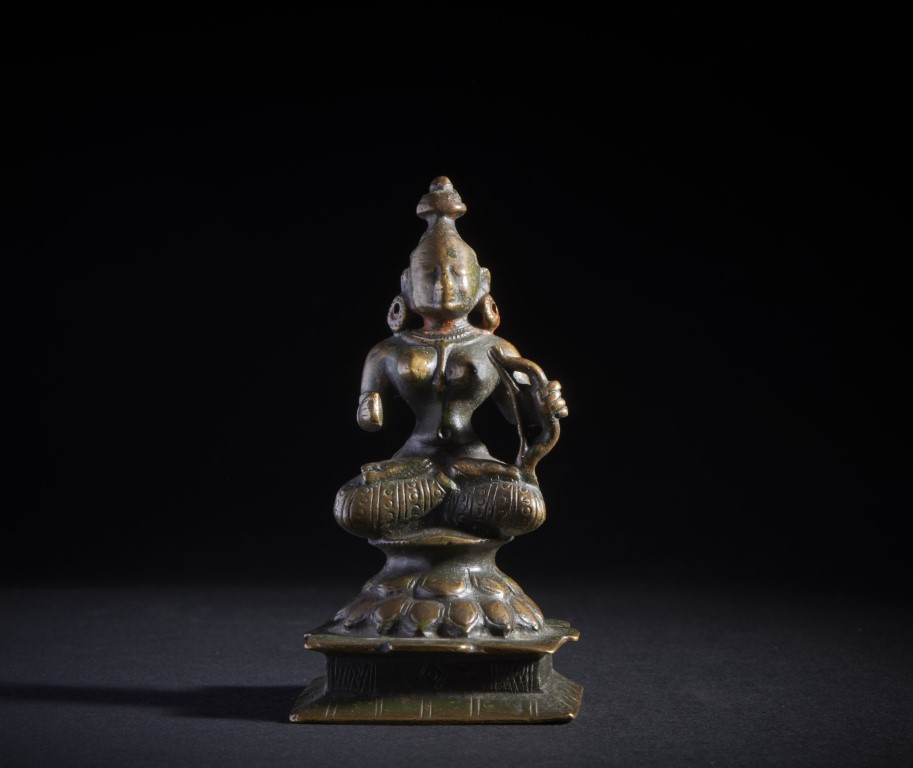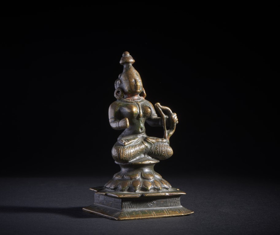 Bronze casting depicting the deity associated with the Sri Yantra, on which he sits with her legs crossed in padmasana. Her left hand bears the sugarcane bow as an attribute.