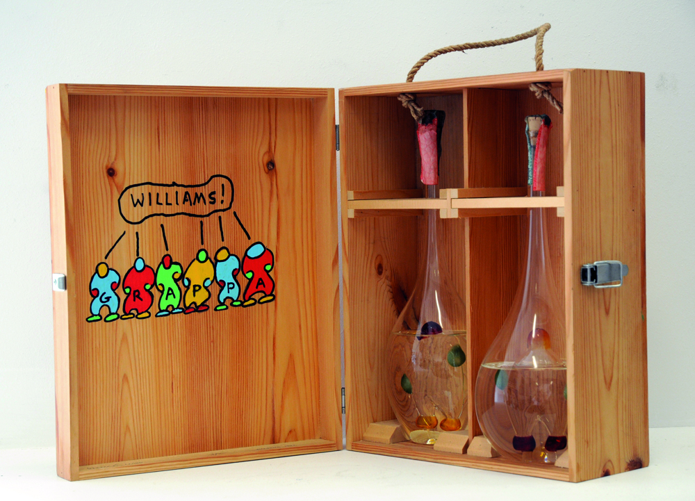 Firmato. EMMET WILLIAMS (1925 – 2007) - " Grappa Williams ", Bottiglie in vetro e scatola in legno, cm. 35 x 56 x 11. Firmato all'interno. Edizioni Lunardon & Scoglio, Vicenza. Prov. Collezione Privata