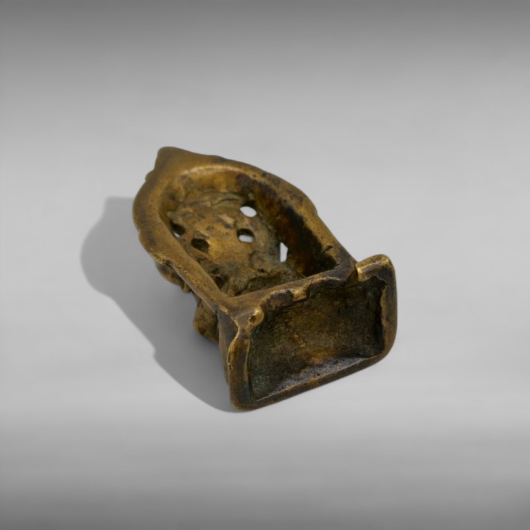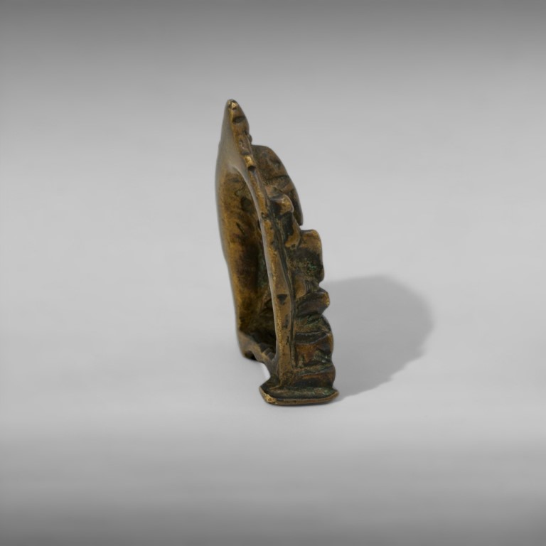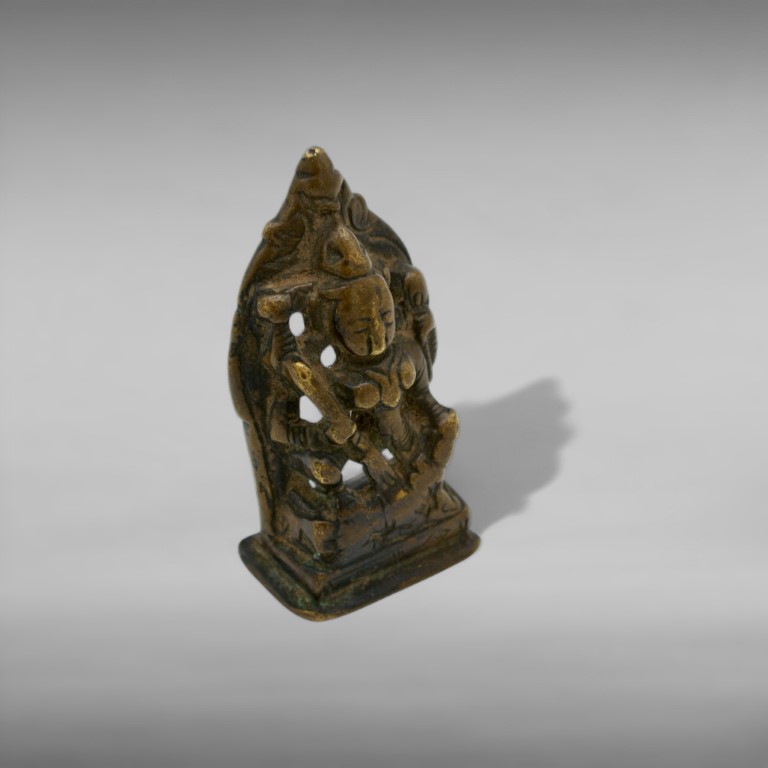 bronze casting with dark patina, depicting Durga Mahishasuramardini in the act of slaying the buffalo demon.