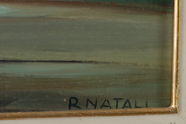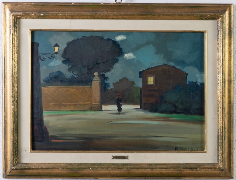 Renato Natali (Livorno 1883 - 1979). Paesaggio notturno. Olio su tavola. Reca firma in basso a destra R. Natali. Cm. 30x50. In cornice cm. 50,5x65,5.