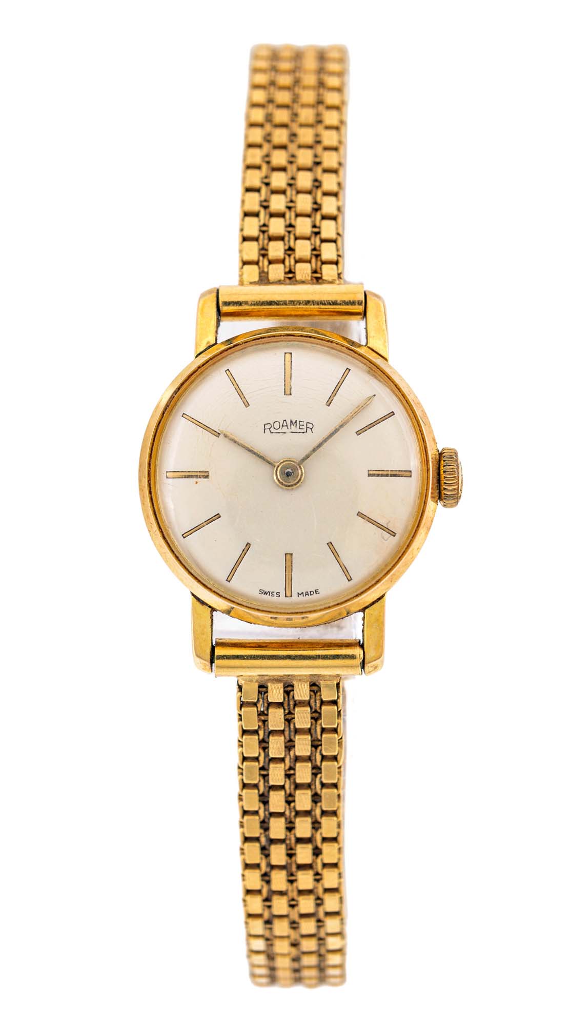 Orologio polso donna in oro Oro giallo 750/000. Cassa n° 17304 laminata in oro, fondello in acciaio a scatto. Cinturino in oro giallo 750/000, quadrante argentato, indici applicati. Movimento manuale. Peso complessivo gr. 25,40 Lunghezza cm 19. Diametro cassa mm. 20. Anni '60