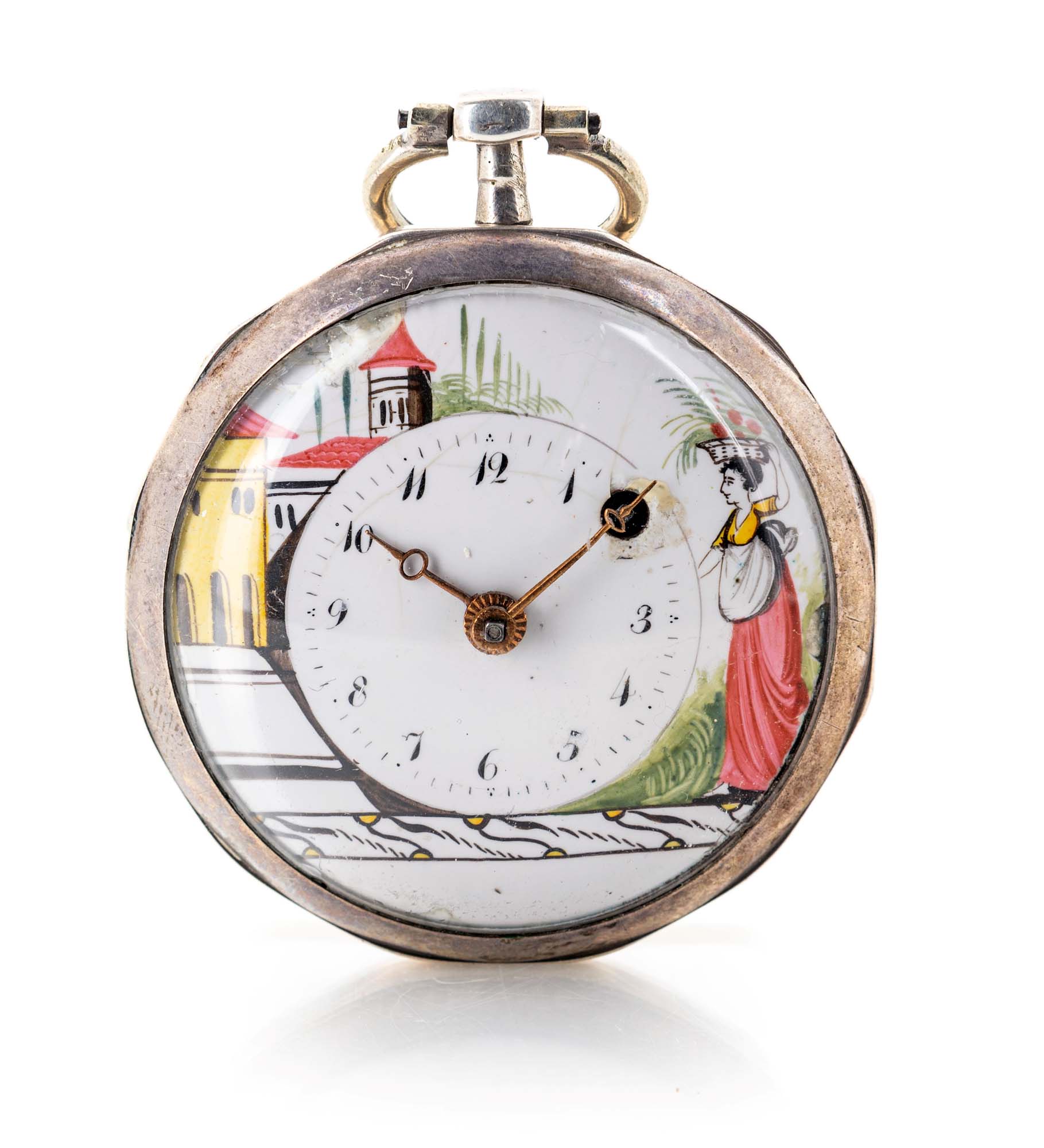 Orologio da tasca rivoluzionario in argento. Argento 800/000. Lunetta sfaccettata, quadrante decorato con smalto raffigurante paesaggio, al centro quadrante con numeri arabi. Movimento a conoide, scappamento a verga. Diametro cassa mm. 53 Primi del XIX secolo