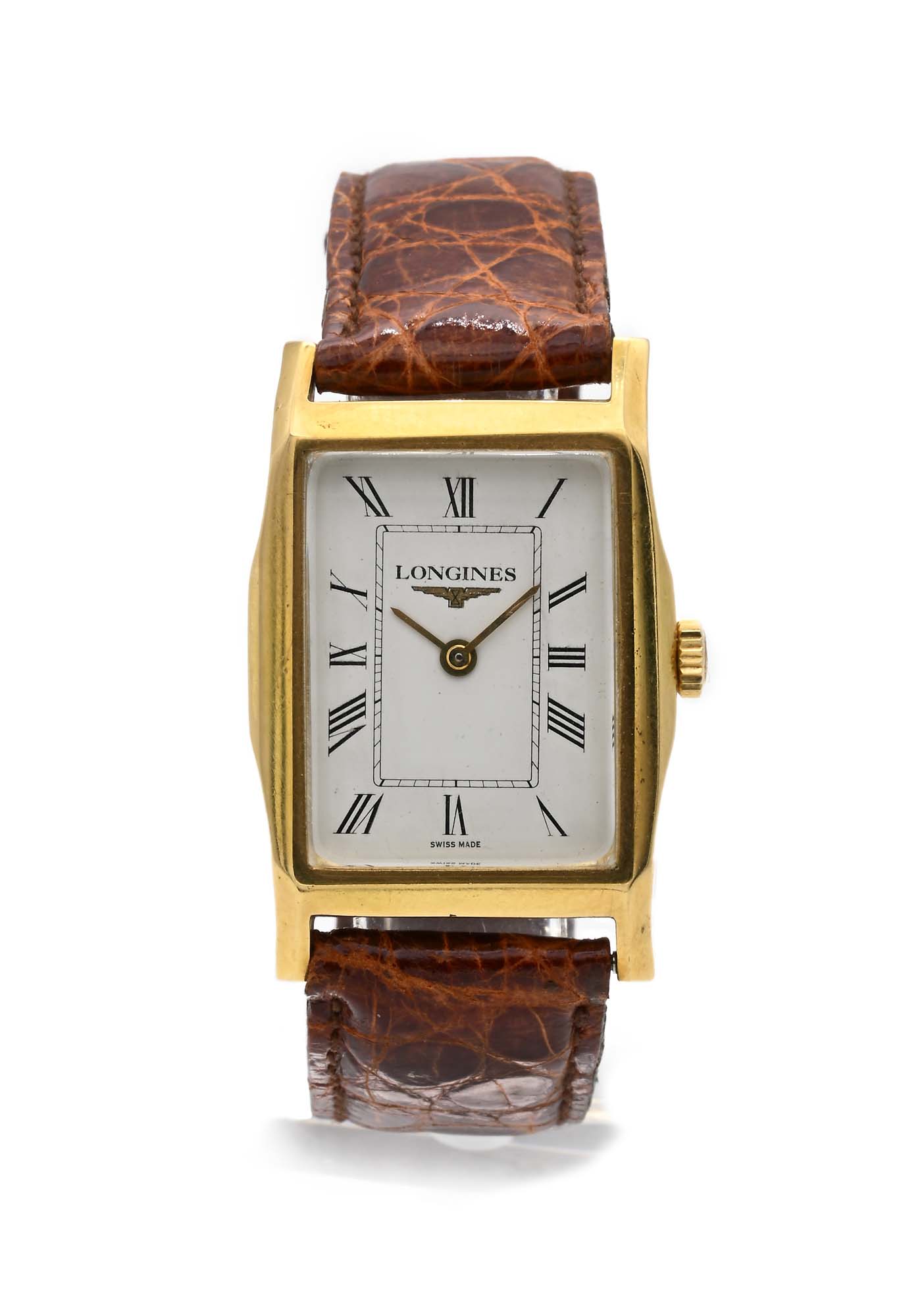 Longines - Orologio da polso in oro Oro giallo 750/000. Cassa nazionale, fondello a scatto, quadrante bianco, numeri romani. Movimento manuale n° 12364309, bilanciere monometallico con viti, spirale piana. mm. 38 x 25 Anni '70