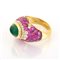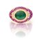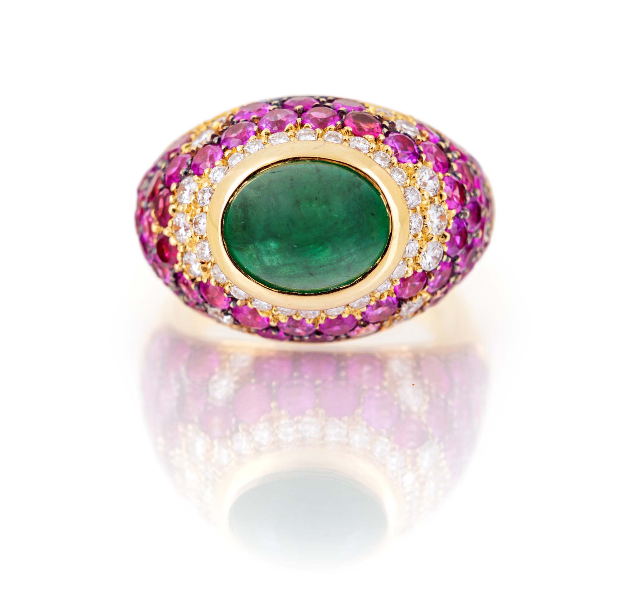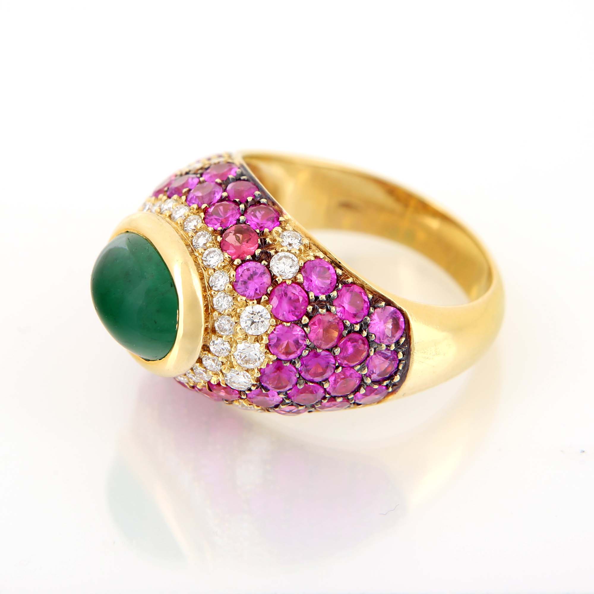 Anello in oro, smeraldo, zaffiri rosa e brillanti Oro giallo 750/000. Smeraldo in taglio cabochon ct. 2, zaffiri rosa e brillanti ct. 2,50 ca. Peso complessivo gr. 13,10 Misura 18