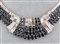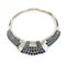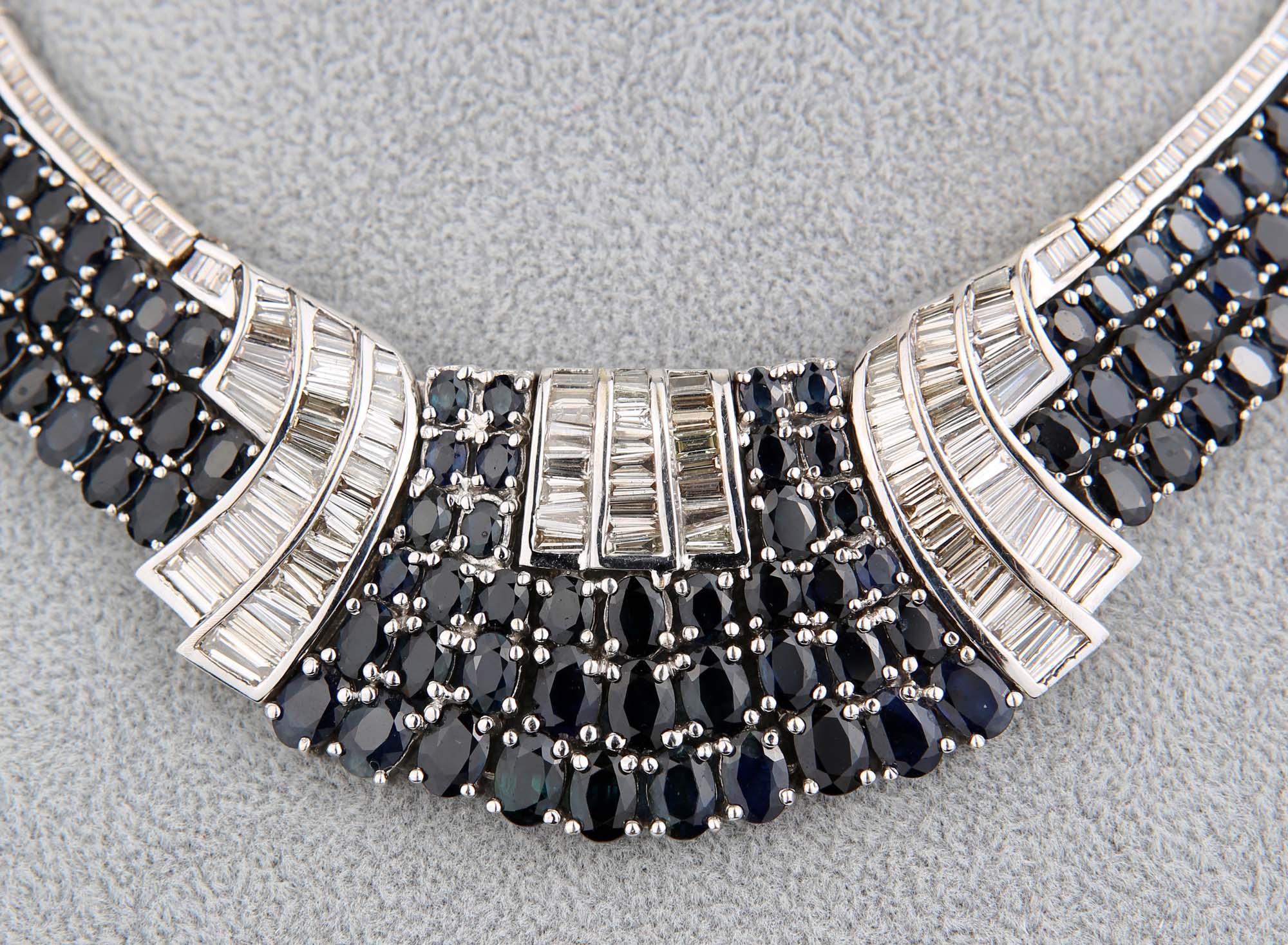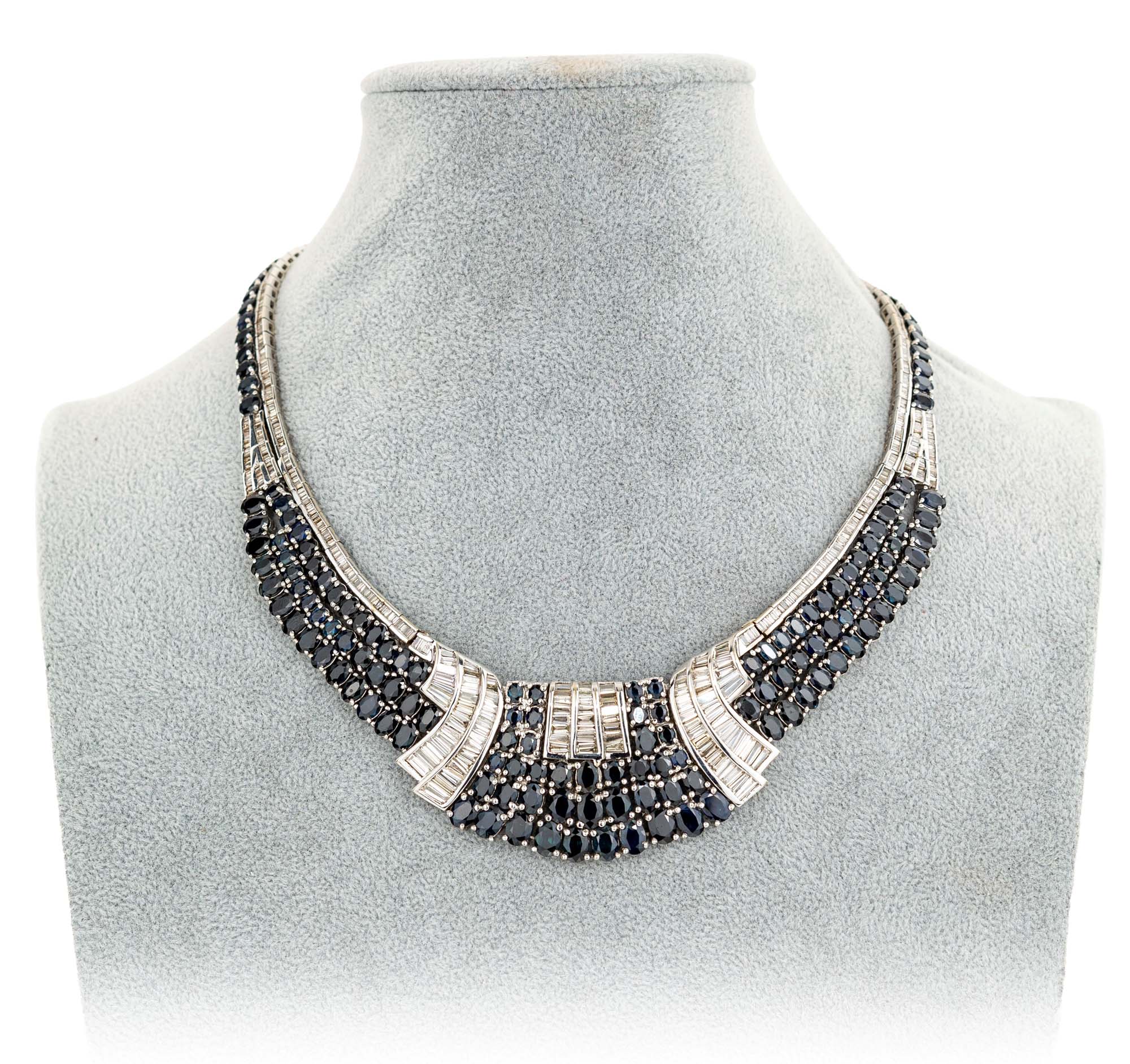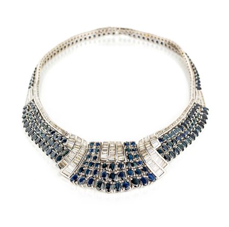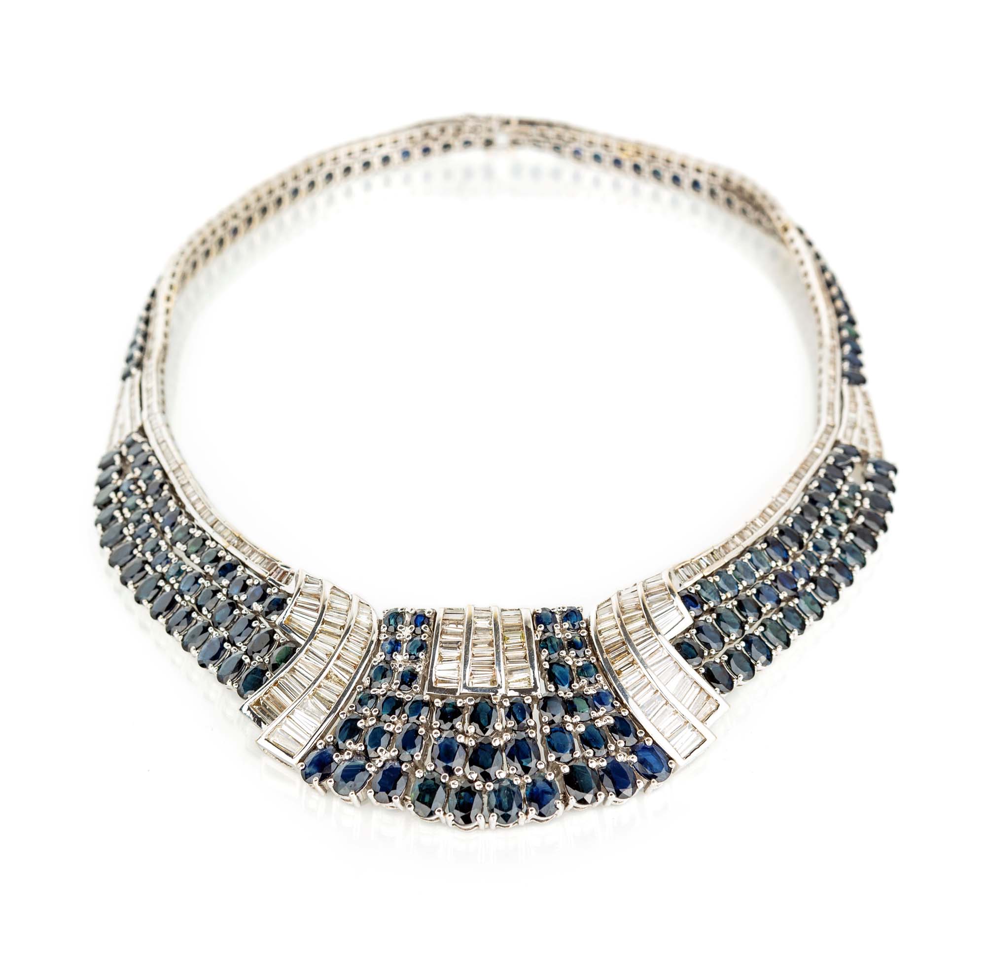 Importante pettorale in oro, zaffiro e diamanti in taglio baguettes Oro bianco 750/000. Diamanti in taglio baguettes ct. 19 ca, zaffiri in taglio cuscino ct. 95 ca. Peso complessivo gr. 144,90 Veste cm 45