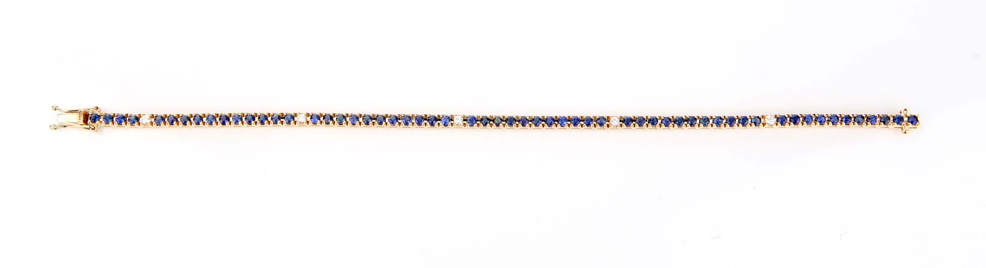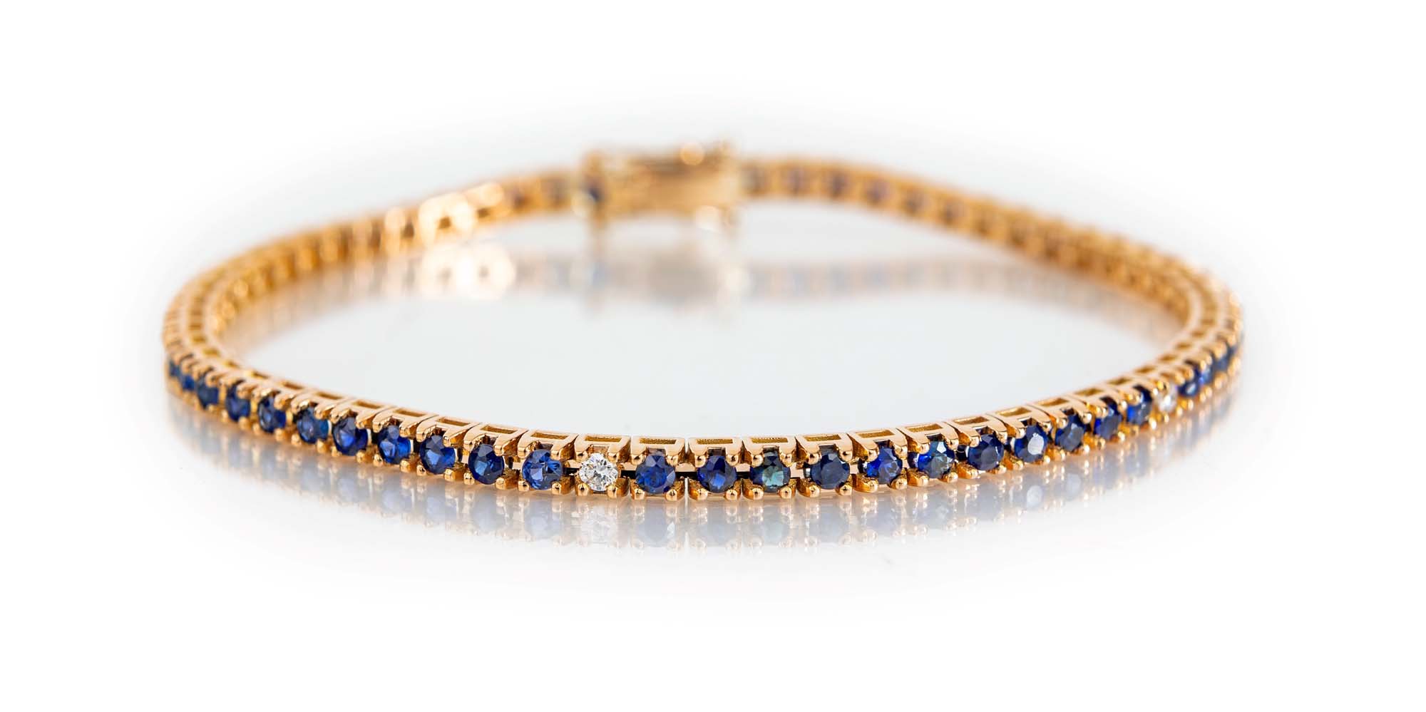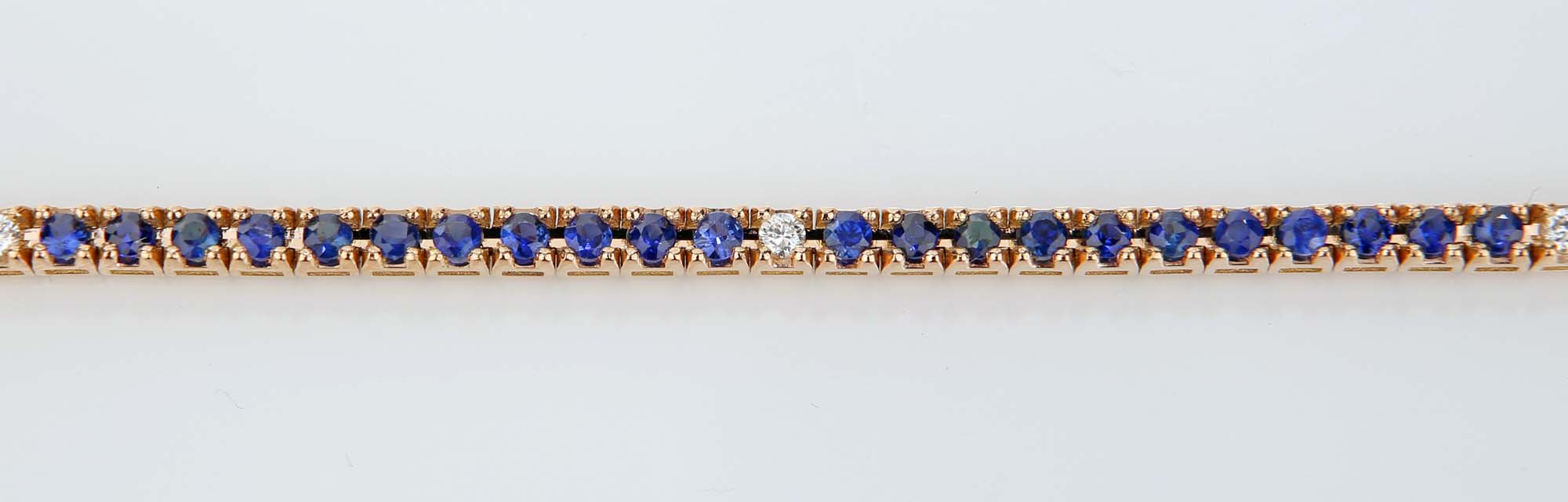 Bracciale tennis in oro, zaffiri e brillanti Oro rosa 750/000. Zaffiri in taglio rotondo brillante ct. 3 ca., diamanti in taglio rotondo brillante ct. 0,20. Peso complessivo gr. 10,30 Lunghezza cm 18