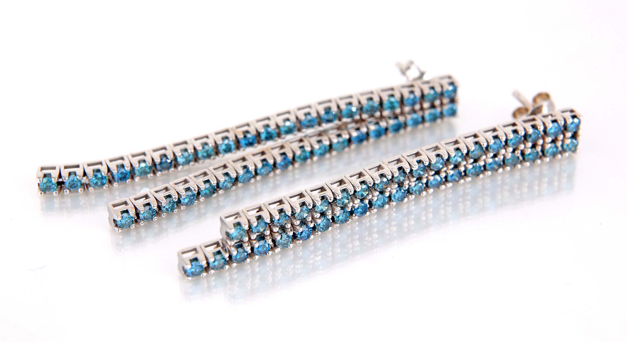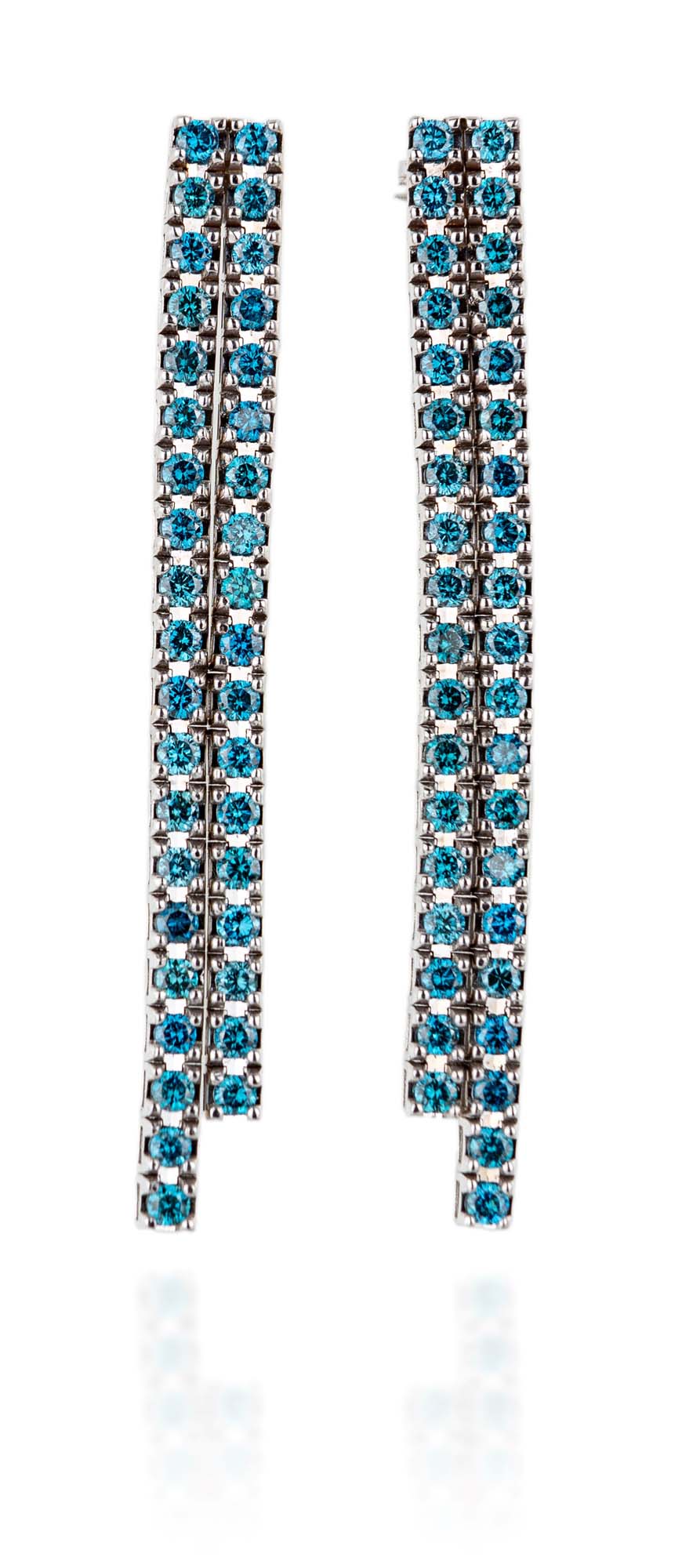 Coppia di orecchini pendenti in oro e diamanti fancy blu Oro bianco 750/000. Diamanti in taglio rotondo brillante, fancy blu ct. 3 ca. Peso complessivo gr. 11. Lunghezza cm 6