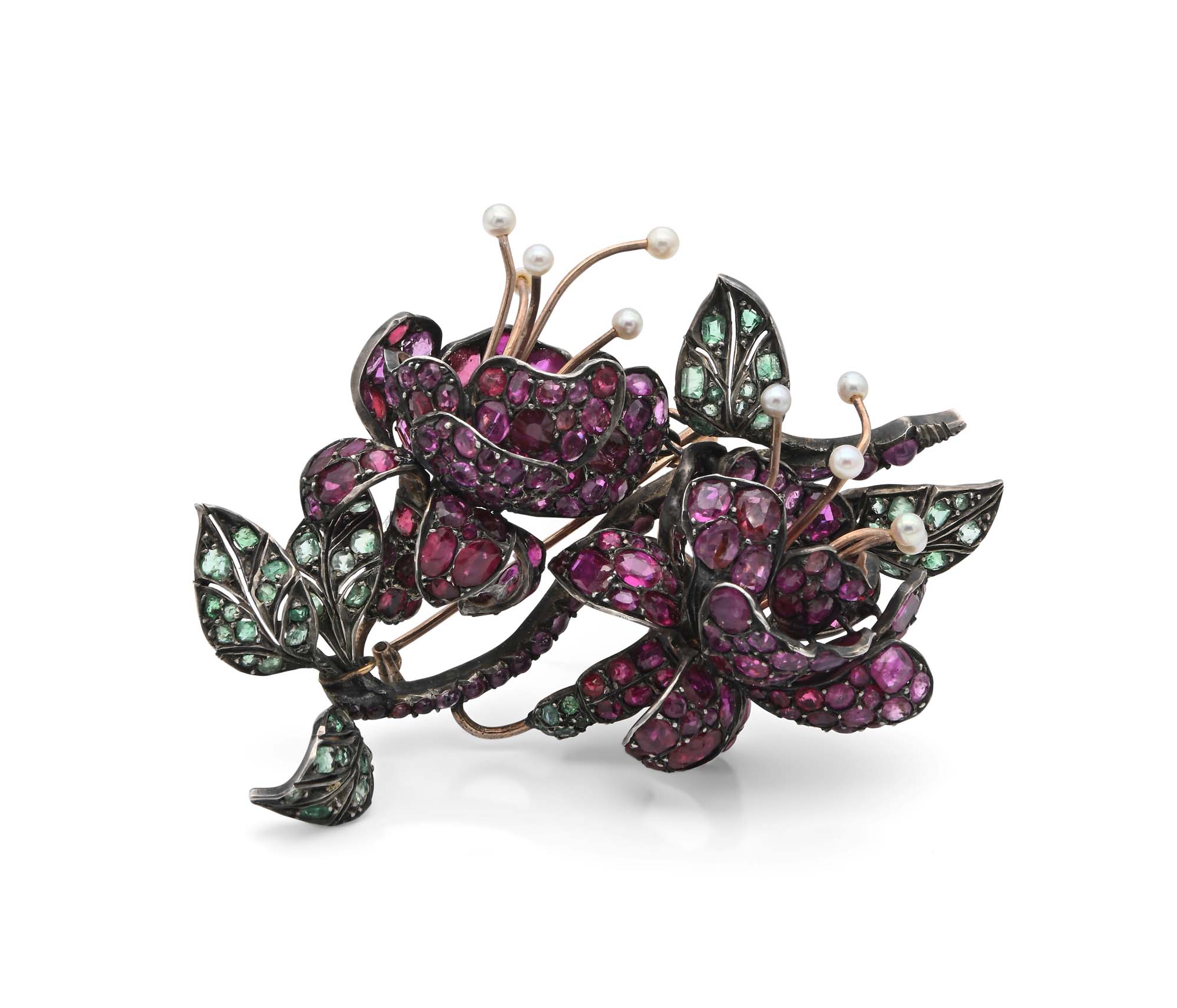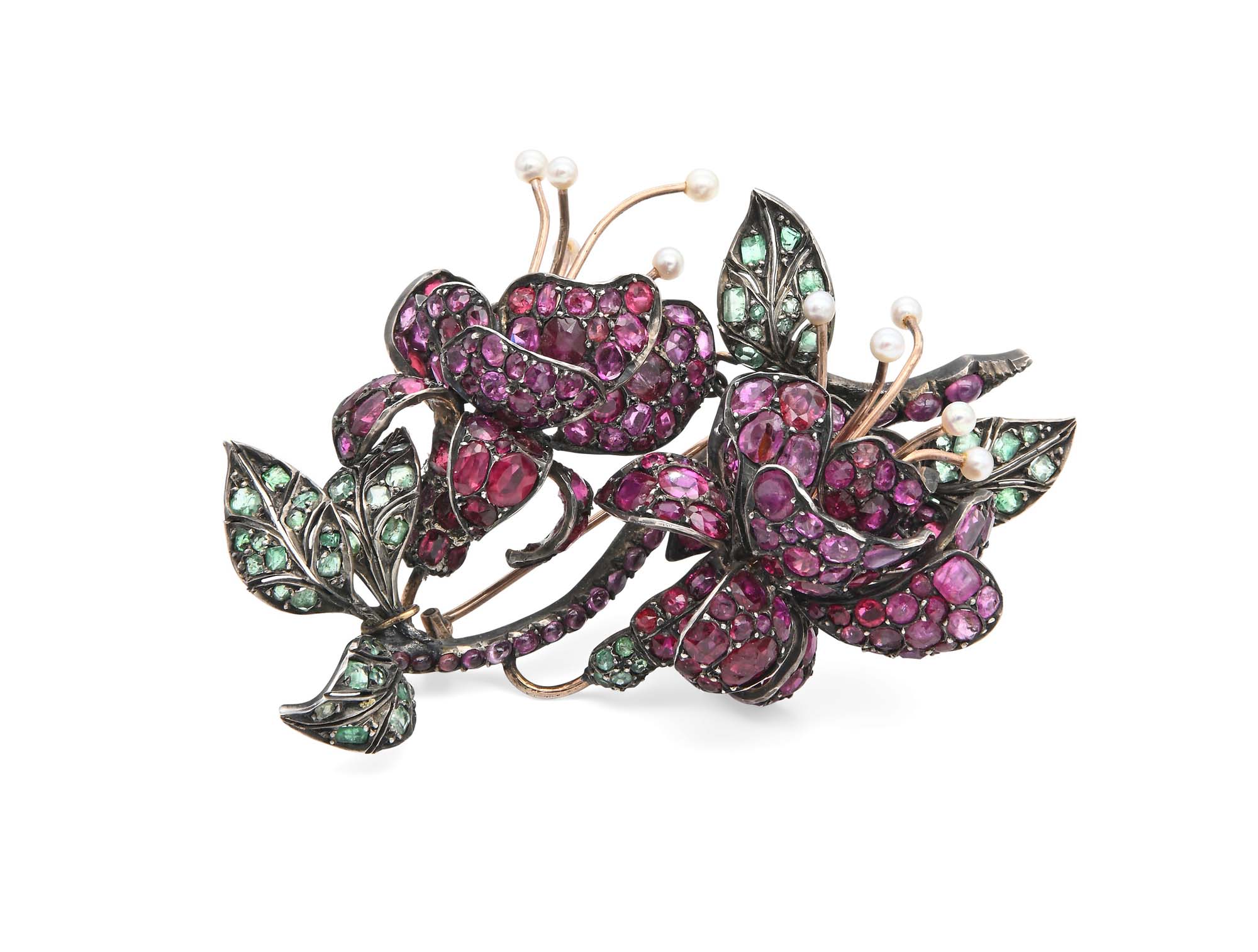 Spilla antica in oro, argento, rubini, smeraldi e perle
