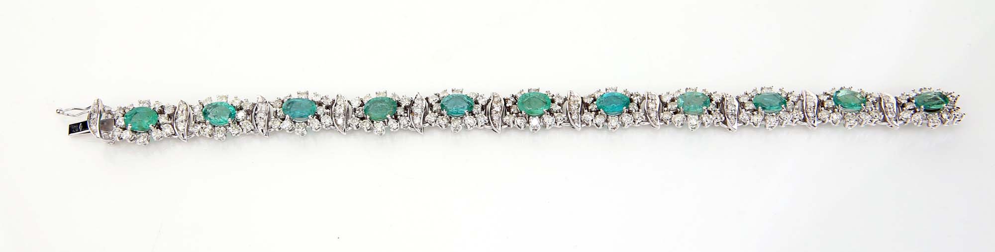 Bracciale in oro, brillanti e smeraldi Oro bianco 750/000. Diamanti in taglio rotondo brillanti ct. 5, smeraldi in taglio ovale ct. 9,50. Peso complessivo gr. 25,20. Lunghezza cm 18