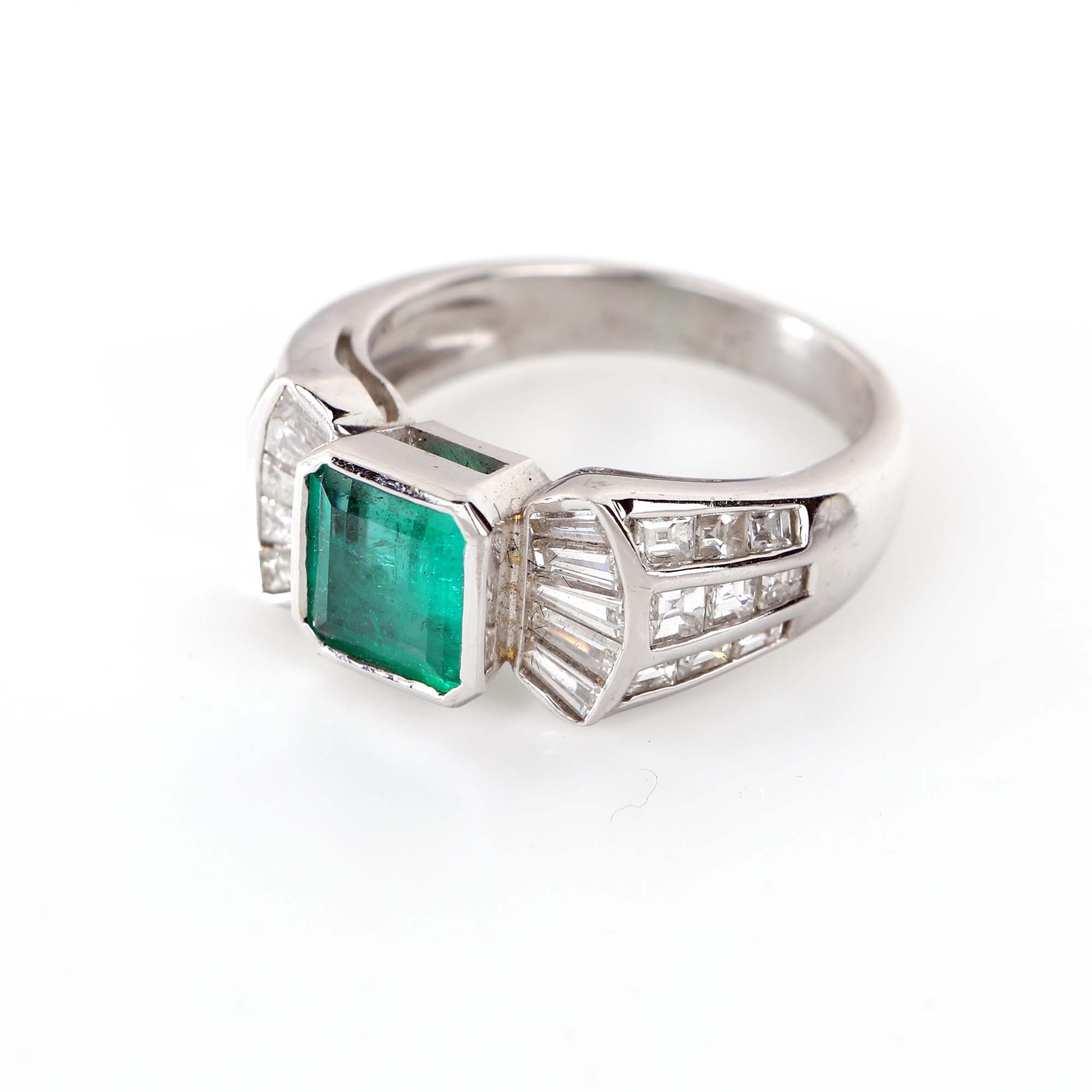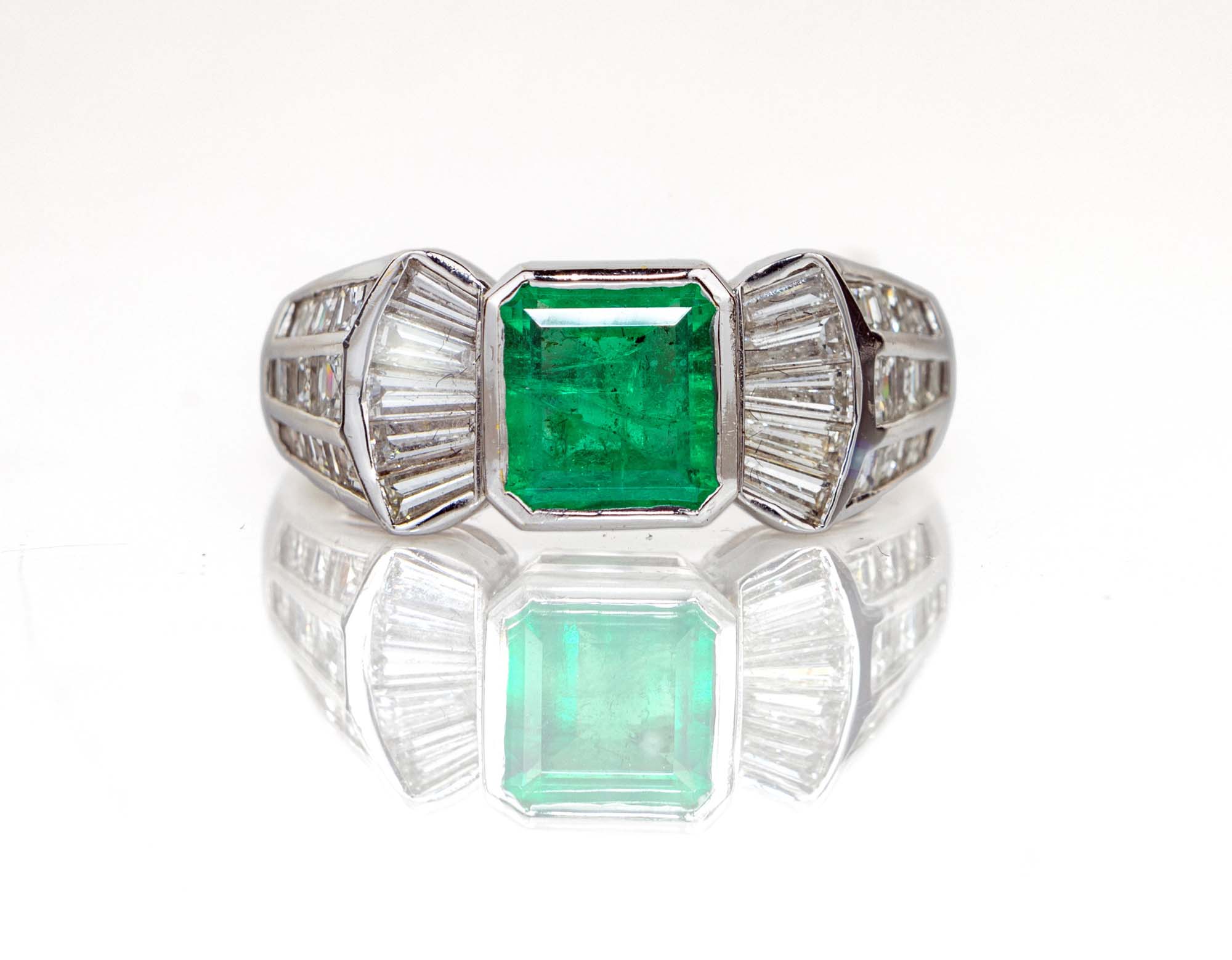 Anello in oro, smeraldo e diamanti Oro bianco 750/000. Smeraldo in taglio smeraldo ct. 1,50 ca, diamanti in taglio tepper e carrè ct. 1,30 ca., prob F-G, VVS-VS. Peso complessivo gr. 7,20 Misura 15