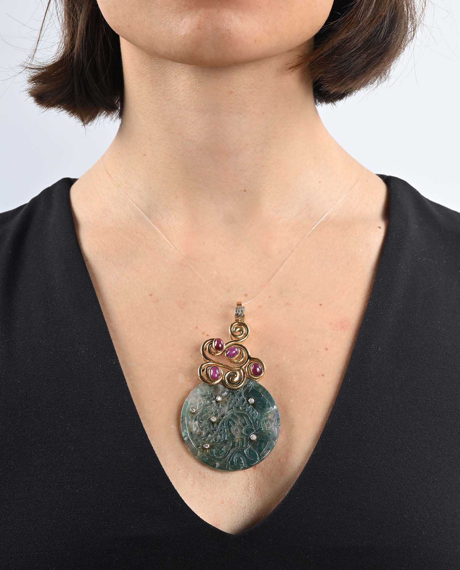 Pendente in oro, rubini, brillanti e giada Oro giallo 750/000. Diamanti in...