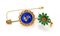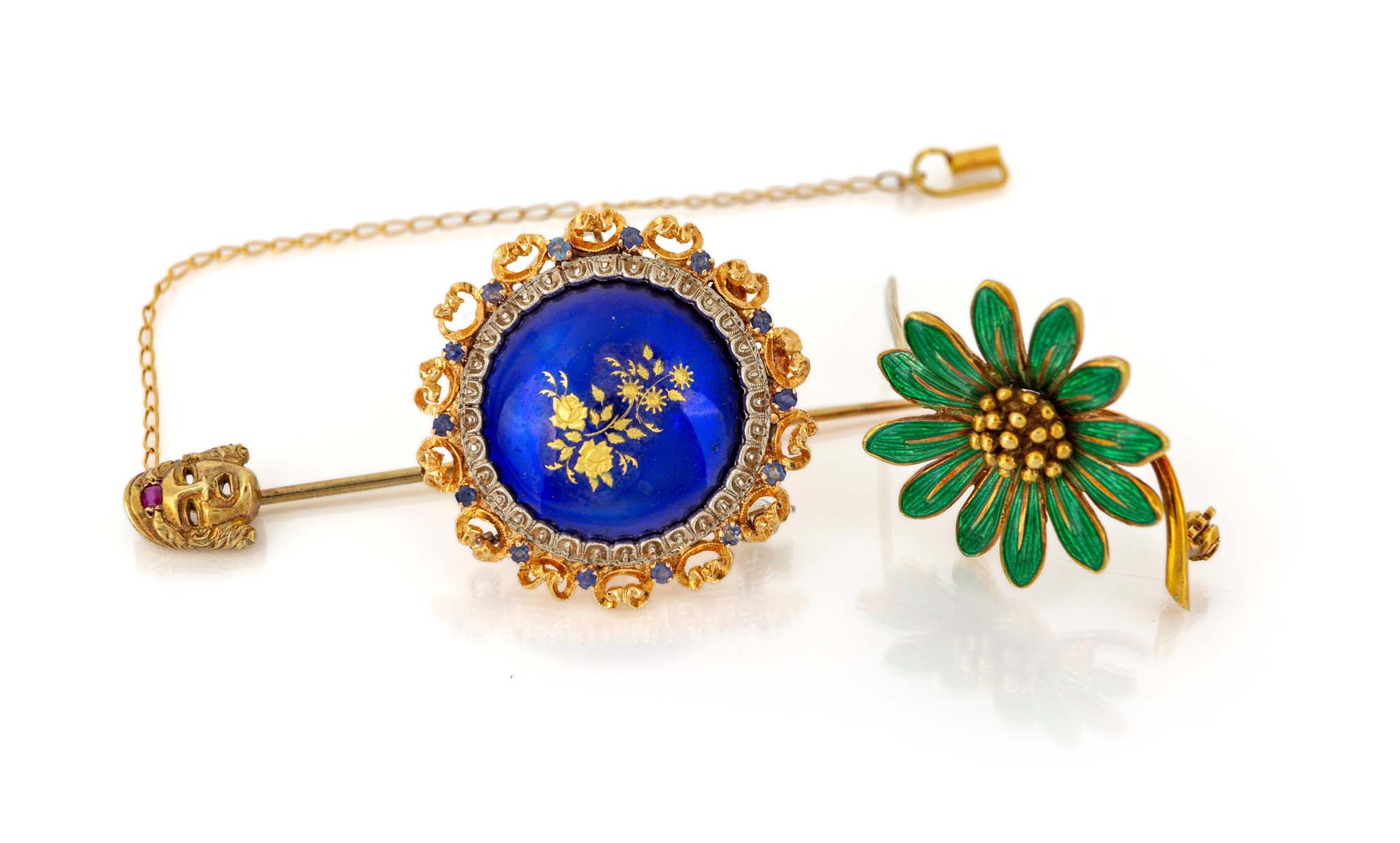 Gruppo di 3 spille in oro, smalti, zaffiri e brillanti Oro giallo 750/000. Peso complessivo gr, 21,60 Diametro cm 3