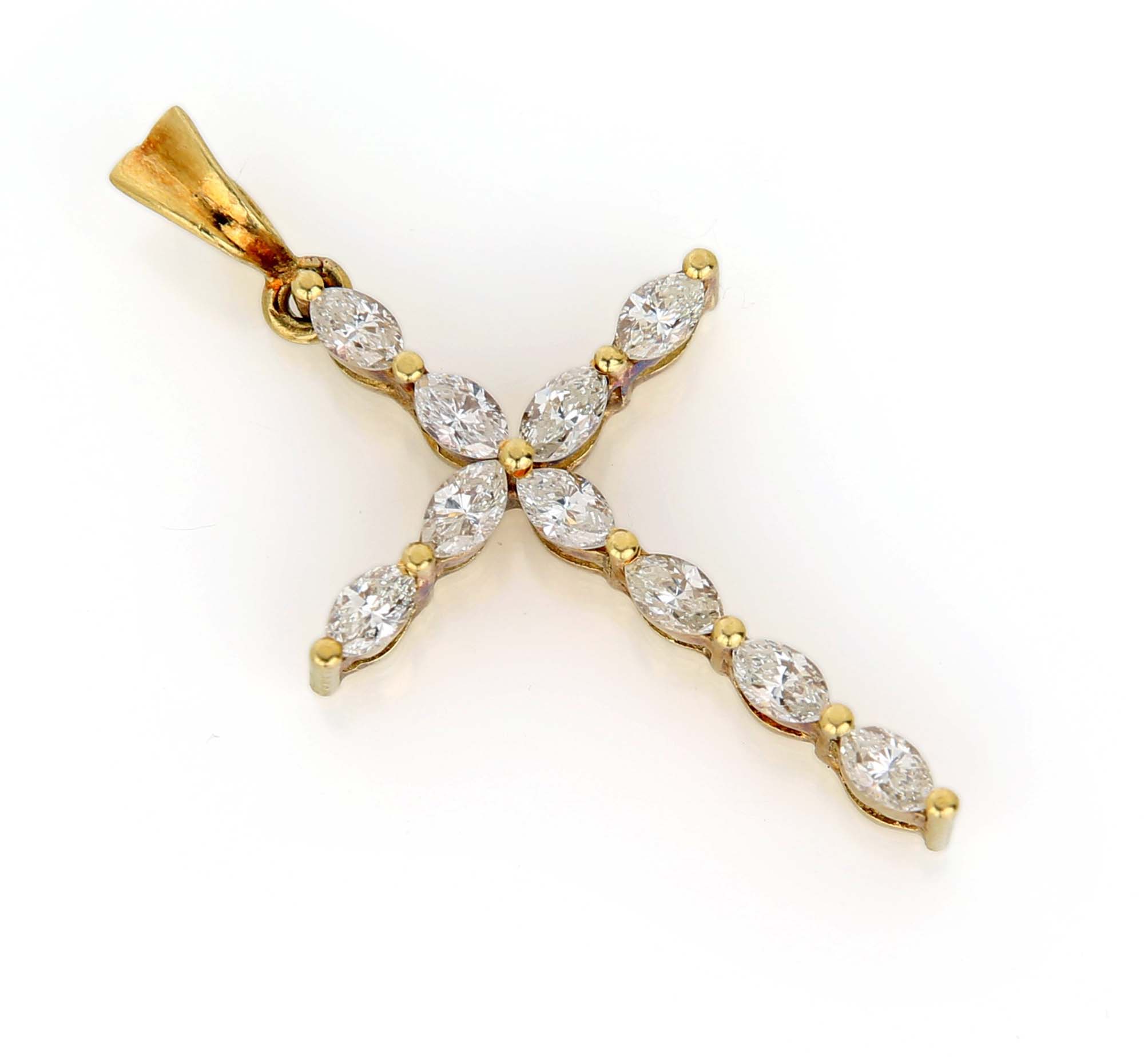 Pendente a croce in oro e brillanti Oro giallo 750/000. Diamanti in taglio navette ct. 0,30 ca. Peso complessivo gr. 1,60 cm 3,5 x 2