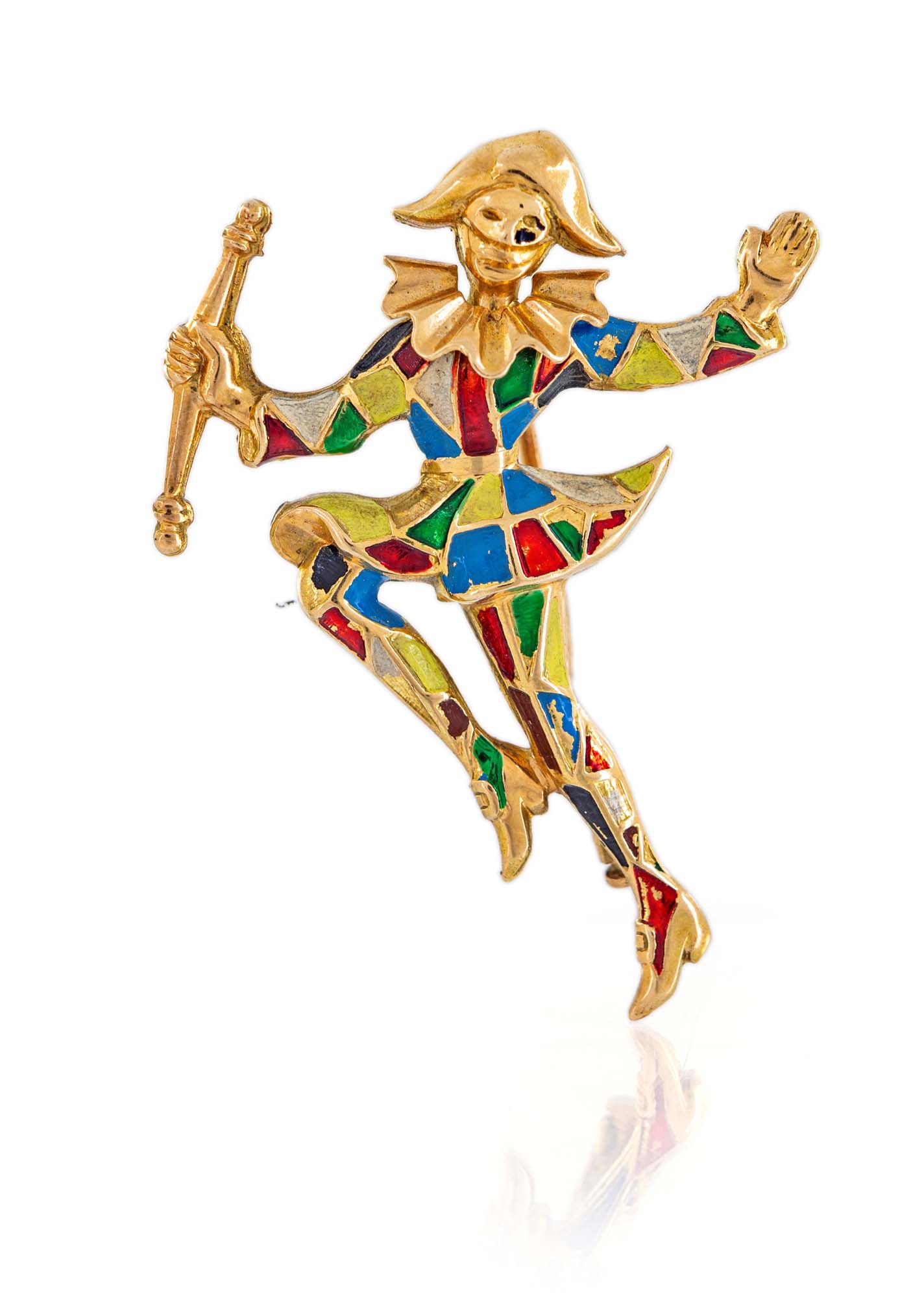 Spilla Arlecchino in oro e smalti Oro giallo 750/000. Peso complessivo gr. 6 cm 4,5 x 3,5