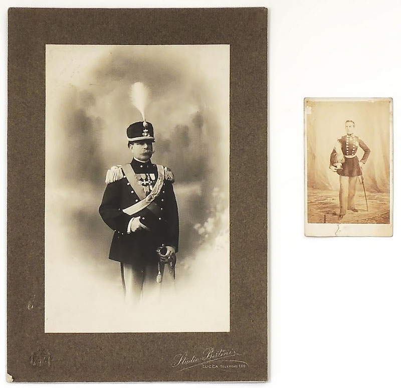 LOTTO DI FOTOGRAFIE MILITARI D'EPOCA - OLD MILITARY PHOTOGRAPHS LOT 1858/1920 varie tecniche tra cui albumine, carte citrate e gelatine - various techniques as albumen, citrate and gelatin silver prints, di nota una CDV raffigurante Vittorio Emanuele III giovane in uniforma da colonnello della Guardia Nazionale - to be noted one CDV representing a young Vittorio Emanuele III wearing the uniform of Guardia Nazionale colonel, montate su cartone - mounted on cardboard (35)