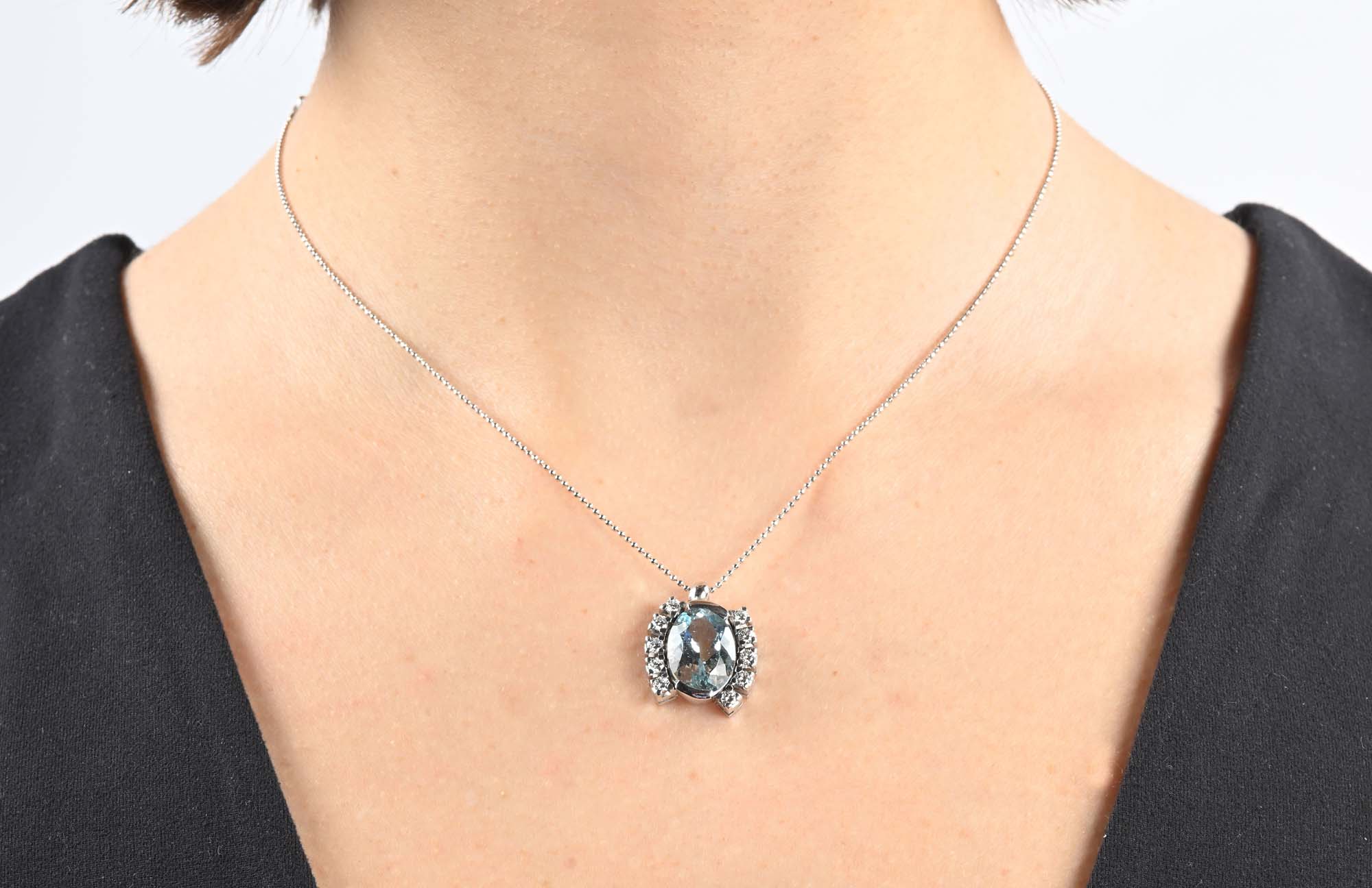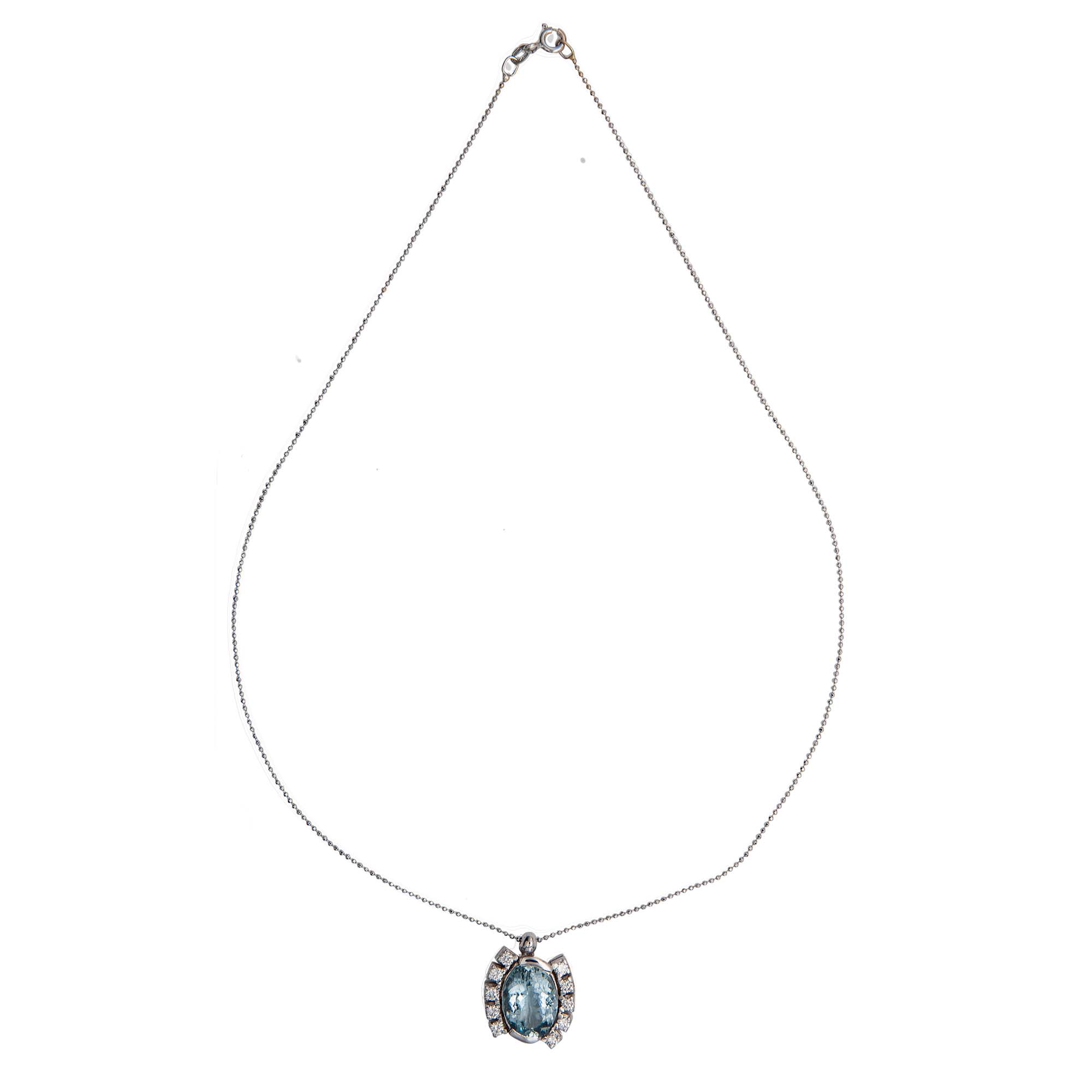 Collana pendente in oro, acquamarina e brillanti Oro bianco 750/000, peso complessivo gr. 7,7. Acquamarina ct. 4,20 ca, brillanti ct. 0,50 ca.