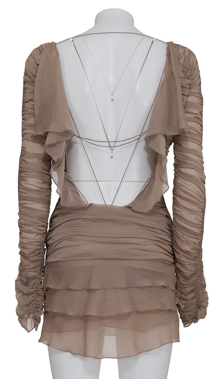 Rare draped long sleeve dress with wide neckline from the Spring Summer 2003 collection. Open back with ruches. 84x100 silk, 16x100 elastane. Size is IT 42. Excellent Conditions, inner stain at front.