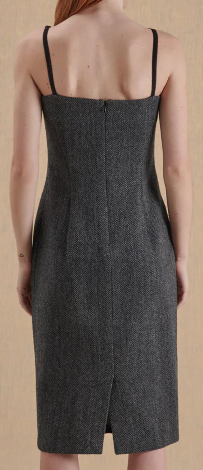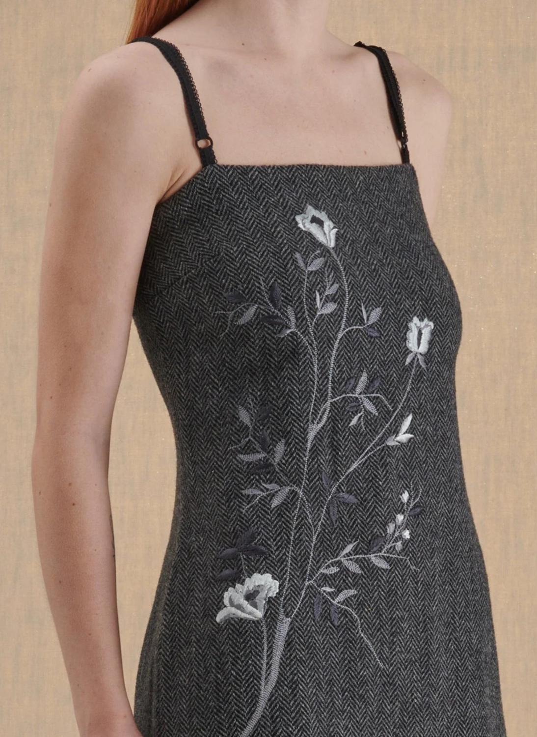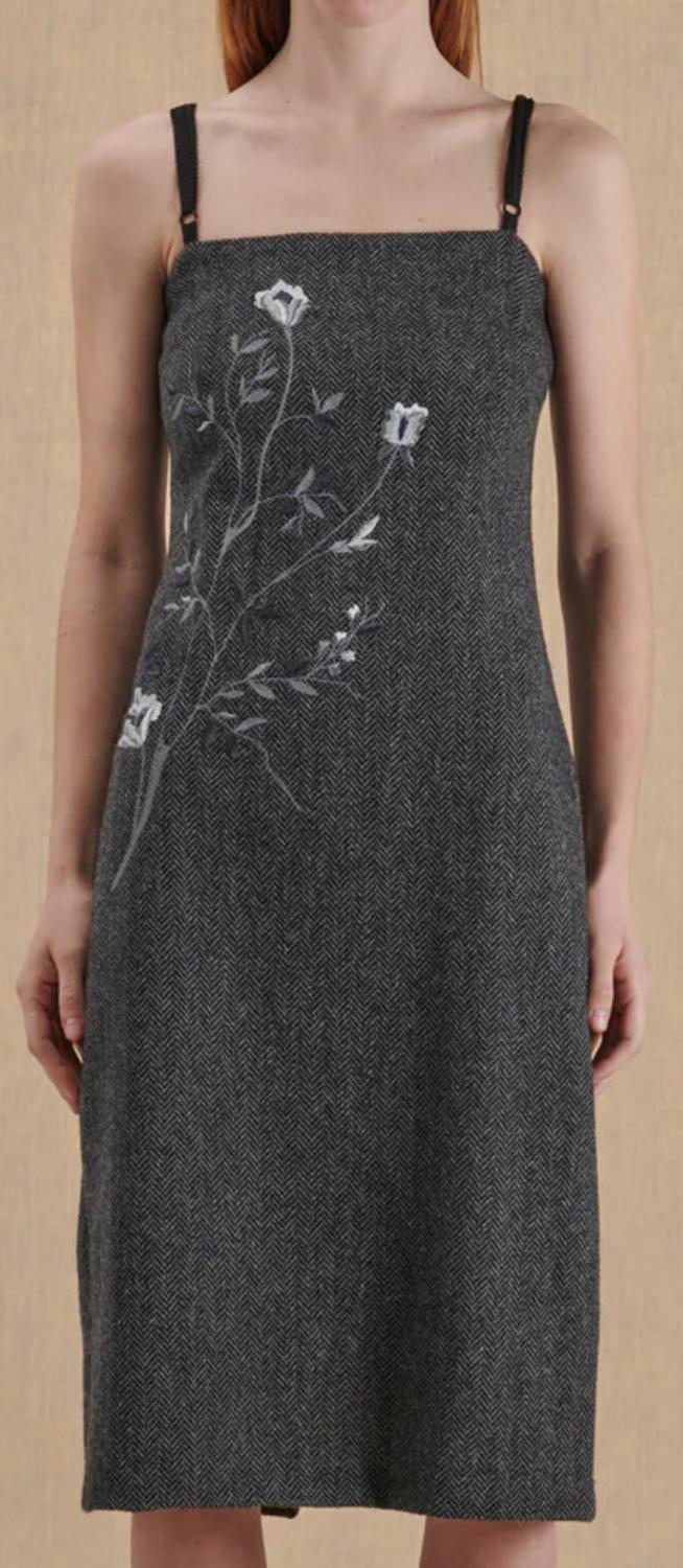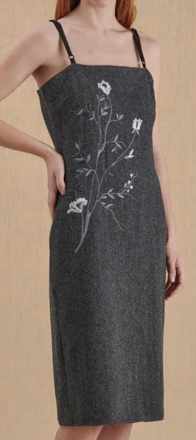 Grey dress in herringbone fabric with embroidery from the D&G collection of the early 2000s. Peculiarity of the garment, the black lingerie-style straps, re-interpreted for the first time by Stefano Gabbana and Domenico Dolce in their collections.