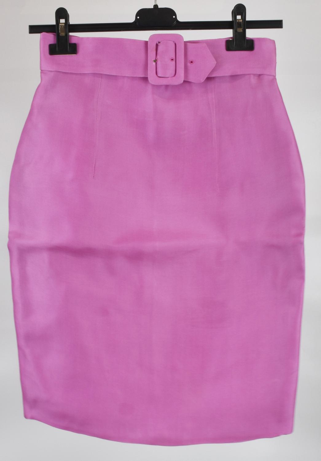 Gonna tubino in seta rosa con cintura in vita. Cerniera posteriore. Taglia 40. Prodotto in Italia. Lievissimi segni d’uso non comprometto le ottime condizioni generali. Ben conservata.