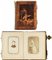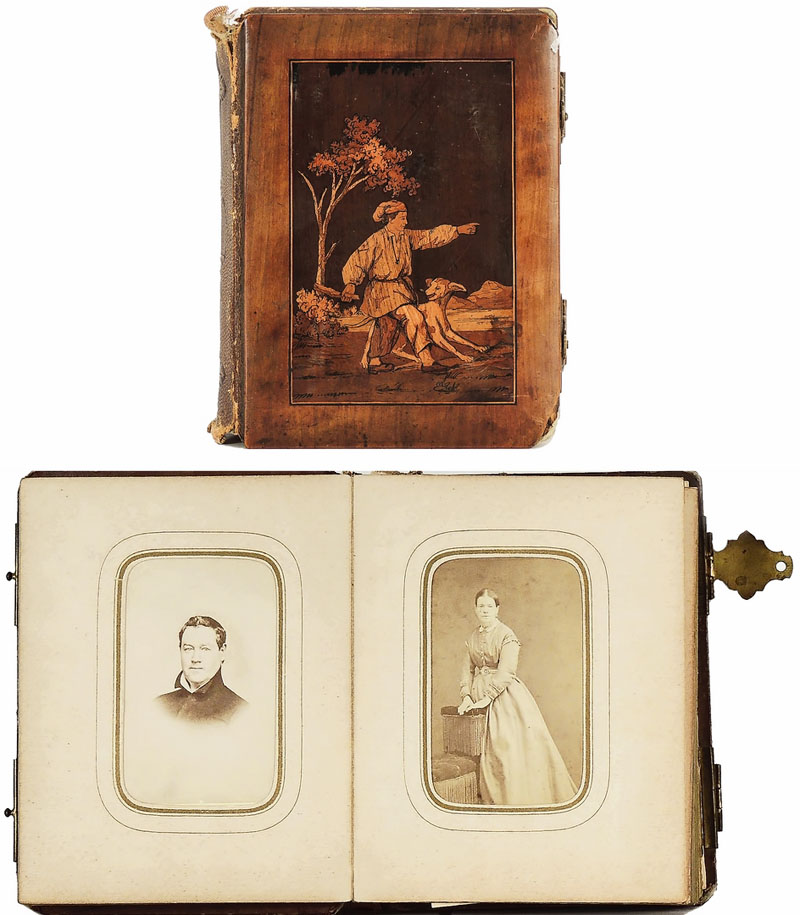 ALBUM fine del XIX/inizio del XX secolo - late 19th/early 20th Century copertina in noce intarsiato in varie essenze e pirografato, contenente carte de visite, difetti - inlaid and pyrographated walnut cover, with CDV, flaws (28)
