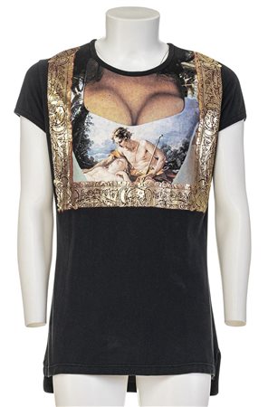 Iconica t-shirt con corsetto effetto trompe l'oeil dei primi anni ’90. Dipinto "Daphnis e Chloe" di François Boucher stampato sul corsetto. 100% cotone. Senza etichetta taglia, veste come una M.