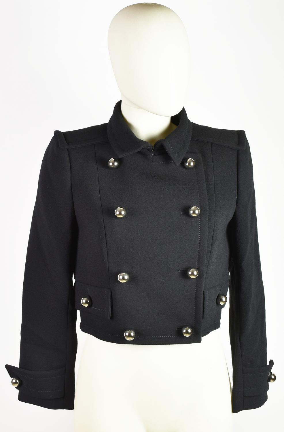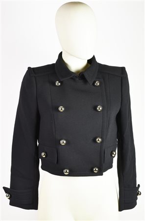DESCRIPTION: Short black military-style jacket. Large spherical metal buttons. Early 2000s, designer Riccardo Tisci. 100% wool. Size 40. Made in France. Never worn, still with tag. Excellent conditions.