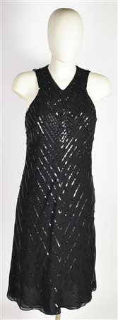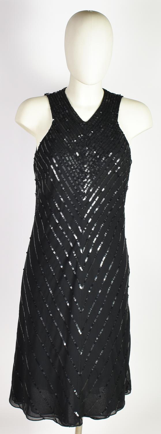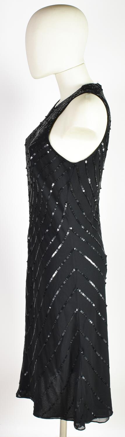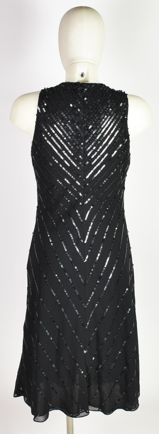 Abito nero senza maniche al ginocchio con motivo di paillettes nere chevron. Chiusura con cerniera sul retro. Taglia 8. 100% poliestere. Made in India. Perfettamente conservato.