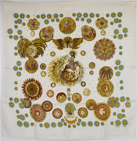 Foulard in seta disegnato da Annie Faivre. Cm 86,00x86,00. Prodotto in Francia. Lievi segni d’uso ma ottime condizioni generali. Ben conservato.