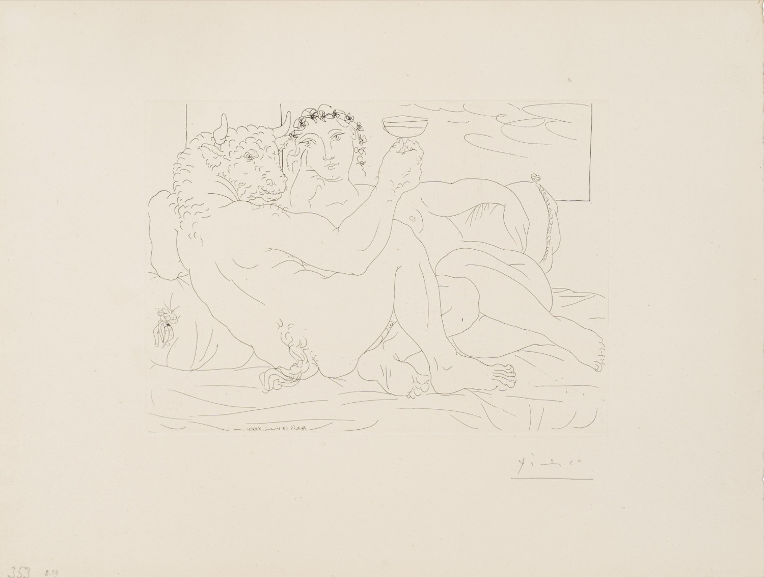 Pablo Picasso (Malaga 1881-Mougins 1973) - Minotaure, une Coupe à la Main, et jeune Femme, Tav. 83 de La Suite Vollard, 1933