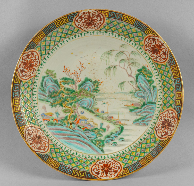 Piatto in porcellana con decoro di paesaggio con figure Famiglia verde Cina fine sec.XIX