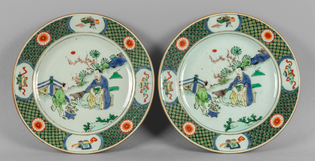 Coppia di piatti Famiglia verde decorati con figura di saggio e simboli taoisti Cina sec.XVIII