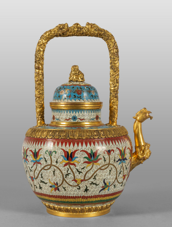 Versatoio in bronzo cloisonnè decorato a fiori di loto presa a forma di draghi coperchio sormontato da figura di kilin marcato alla base Cina sec.XIX